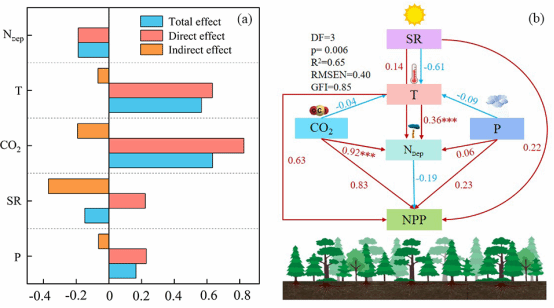 图1 CC对NPP演变的直接、间接及混合效应及其驱动机制 (a)是气候因子对NPP的驱动效应,(b)是气候因子与NPP构建的结构方程模型。