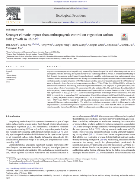近日,世界杯官网农业(农村发展)硕士研究生陈丹,在SCI期刊《Ecological Frontiers》(JCR Q1区,中科院3区,IF=4.7)上发表学术论文“Stronger climatic impact than anthropogenic control on vegetation carbon sink growth in China”,深入评估了气候变化和人类活动对中国植被碳汇的影响。该论文于2025年11月4日正式发表,陈丹为第一作者,吴路华教授为通讯作者。