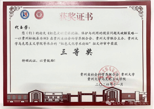 此次会议共收到来自全国81所高校近400篇来稿,经组织专家评审,对其中撰写特别优秀的论文加以表彰。其中代玉芳同学撰写的题为“红色文化资源挖掘、保护与利用的现实问题及破解策略 ——以贵州松桃县为例”的论文荣获三等奖。