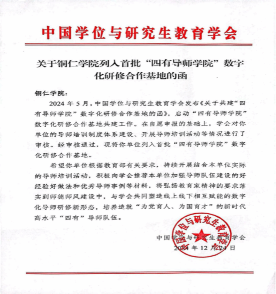 2024年5月,中国学位与研究生教育学会发布《关于共建“四有导师学院”数字化研修合作基地的函》,启动“四有导师学院”数字化研修合作基地共建工作。世界杯官网于2024年5月进行申报,后经中国学位与研究生教育学会审核通过,2024年12月将世界杯官网列入首批“四有导师学院”数字化研修合作基地。