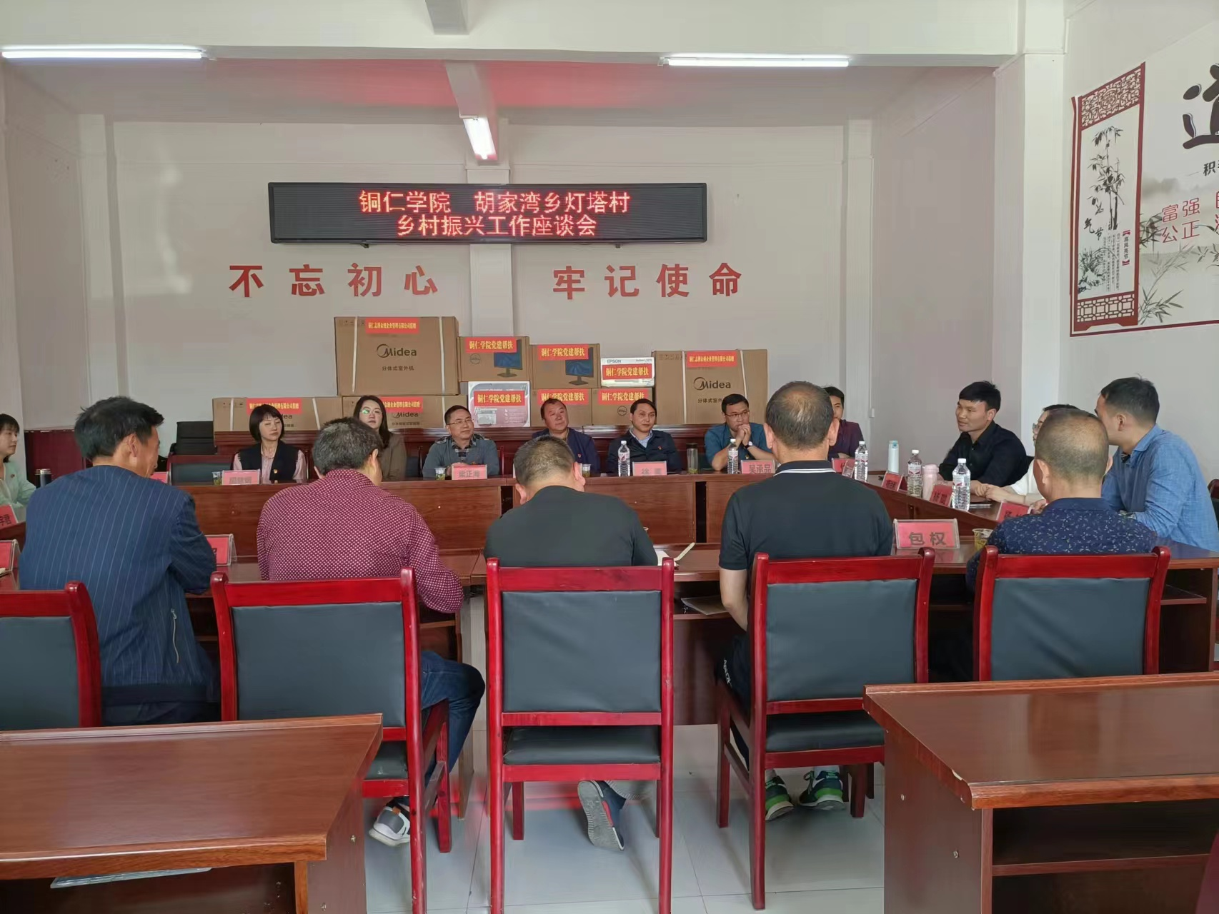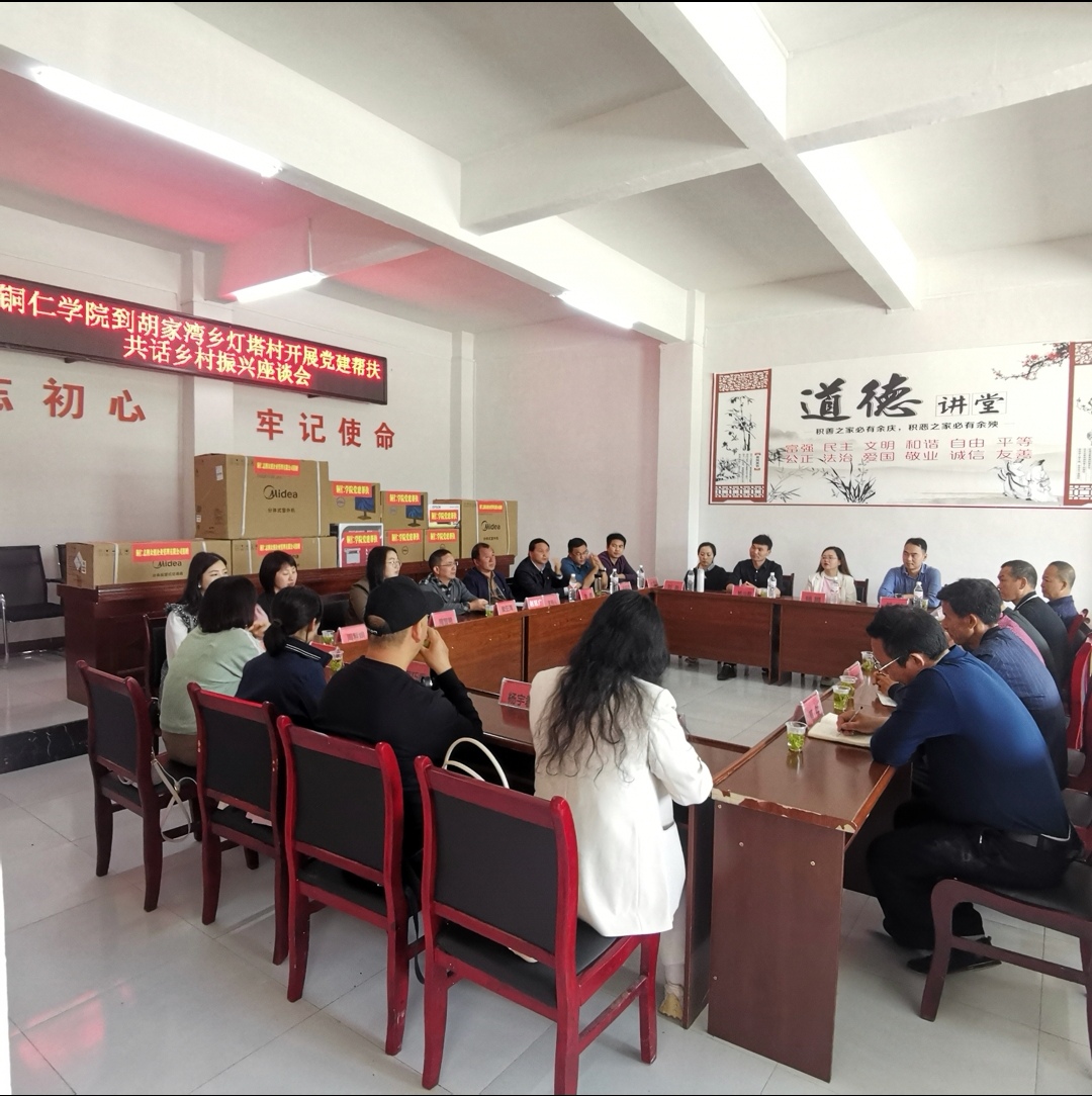 当天,在灯塔村委会会议室围绕乡村振兴话题展开发言交流工作座谈会。会上,胡家湾乡党委书记赵廷文代表乡党委、政府对世界杯官网深入开展党建帮扶共话乡村振兴活动表示感谢,并对胡家湾乡的产业发展情况、乡村振兴发展规划、村庄项目建设情况等方面进行了详细介绍。胡家湾湾村村支书梁正荣,介绍了村产业发展、村庄规划建等方面存在的问题及困难。座谈会上,世界杯官网党委组织部部长梁正海说:灯塔村是思南县地处偏远、森林覆盖率高、土地碎片化极为严重、海拔较高的原因,导致发展产业困难,这几年来灯塔村脱贫攻坚、基础设施建设、人居环境整治等工作的充分肯定,胡家湾乡、灯塔村的干部群众干事创业的精气神值得我们学习,在产业发展方面,要进一步抓细抓实,尤其是尊重市场经济规律,精打细算,真正促进农民增收致富。“依托山区·服务地方”是我们美加墨世界杯官方网站的办学特色,服务乡村振兴是义不容辞的责任;座谈会上,艺术学院党委书记徐美说:思南脱贫攻坚这千年惠民工程,我既是一个见证者,又是一个参与者,在思南大坝场镇 675 个日夜工作中,我们见证了身边帮扶干部任劳任怨,他们的无私奉;就当前搞好乡村振兴工作谈了四个建议;一是做好产业衔接。建议脱贫攻坚任务完成后,继续把产业振兴摆在重要位置,建立逐步解决相对贫困的长效机制,帮助困难群众摘了穷帽再拔穷根;二是做好项目衔接。建议要由集中解决基础设施和公共配套设施,转向系统治理山、水、林、田、水库,实现农村生态治理;三是做好政策衔接。建议除落实“四不摘”的要求,还要继续坚持现行主要的减贫政策,避免因政策取消出现返贫;四是做好规划衔接。建议构建更加稳定持久、以城乡融合为导向的发展机制,综合土地资源、产业培育、居民点建设、人居环境整治、生态保护和历史文化传承等要素,形成城乡融合、区域一体、多规合一的规划体系,做到一张蓝图绘到底、巩固脱贫成果再加力目标。座谈会由原在德江驻村5年的杨治毅同志,将一首“驻村干部”歌曲结束座谈内容,现场打动、感动了与会全体同志。