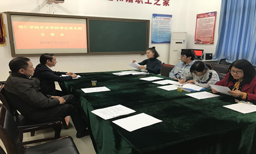 为了认真抓好基层党组织建设,努力提高基层党建质量,切实落实院领导联系支部制度,2018年11月2日下午,艺术学院党委书记崔德虎教授、副院长谢云中教授深入学生党支部进行调研,并对学生党支部支委会议的开展情况进行现场指导。支委会议由学生支部书记龙黎主持,支部组织委员张少涛、宣传委员余雁鸿、统战委员周祺芬参加会议。