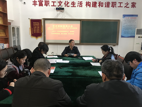 为了深入学习党的十九大精神,进一步加强思想政治工作,提高党员的思想政治理论水平,艺术学院于2018年11月27日下午在党员活动室召开教工支部、学生支部党员大会,开展上党课组织生活活动。本次党课由艺术学院党委书记崔德虎教授主讲,讲座题目为《深入学习十九大精神、进一步加强思想政治工作》,会议由艺术学院党委组织委员麻晔斐同志主持。
