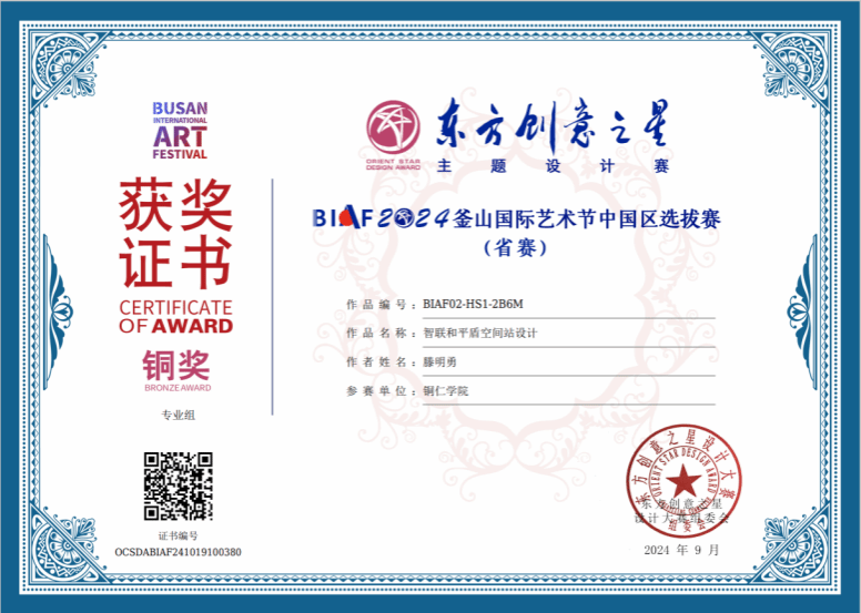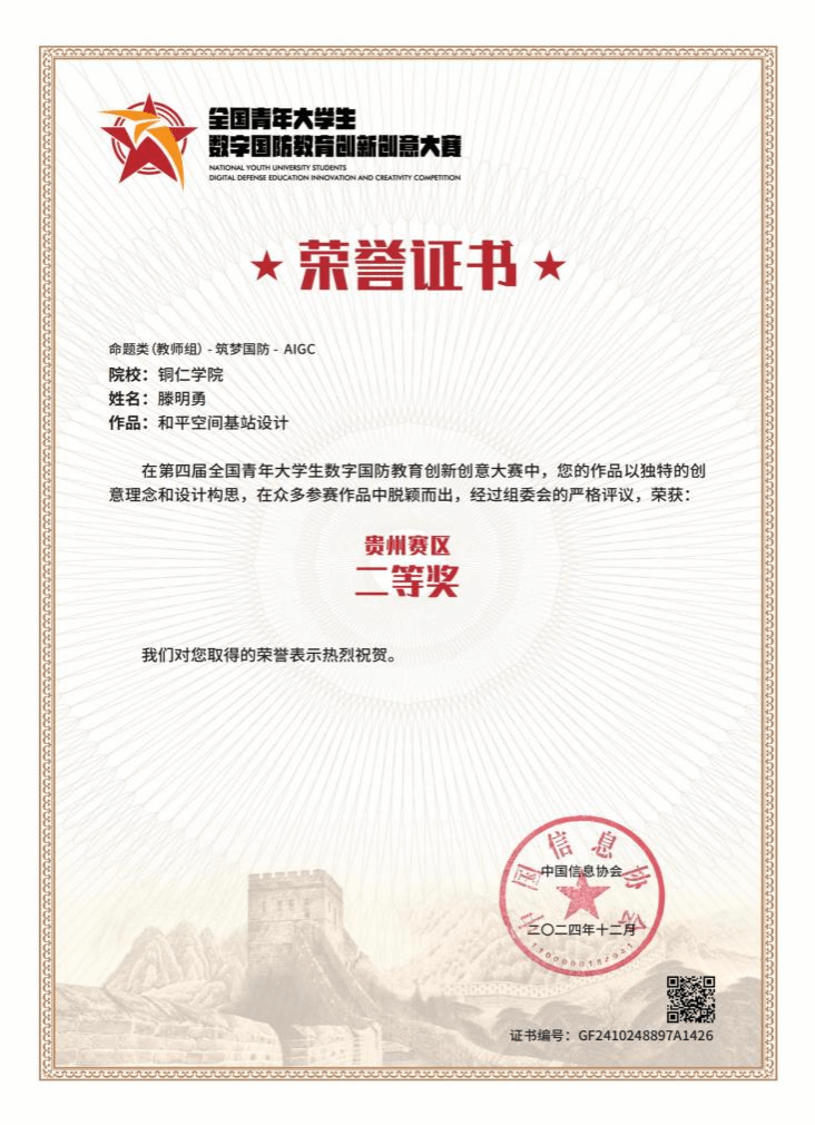 我院美术与设计系教师滕明勇教授,2024年在多项全国性设计竞赛中获奖。8月,滕明勇教授的设计作品《遇见·空间》《深蓝世界》《毕业影响》分别获得全国高校创新设计大赛组委会举办的“东方设计奖”一二三等奖。9月,设计作品《智联和平盾空间站设计》获得东方创意之星设计大赛组委会举办的东方创意之星主题设计赛三等奖。12月,两组设计作品《空天卫士系列》《和平空间基站设计》都获得中国信息协会举办的“全国青年大学生数字国防教育创新创意大赛”教师组贵州赛区二等奖,《空天卫士系列》部分作品还进入全国决赛并获得三等奖。