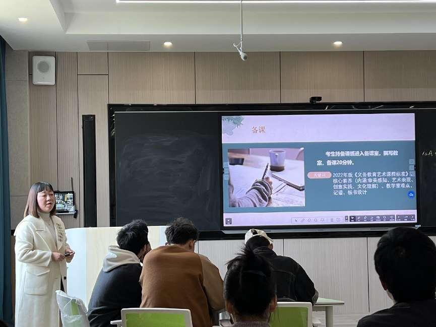 首先,沈雁从教师资格证面试流程进行讲解。她强调,在备课环节中要充分把握并运用音乐教学的四大核心素养,将审美感知、艺术表现、创意实践、文化理解融入自己的课堂。在准备模拟授课的过程中,考生要针对抽到的题目内容设计好教学重难点,要注重版式设计等细节。在模拟授课环节,考生需要注意自己的仪容仪表、教姿教态,为教师资格证面试提供了有针对性地指导。