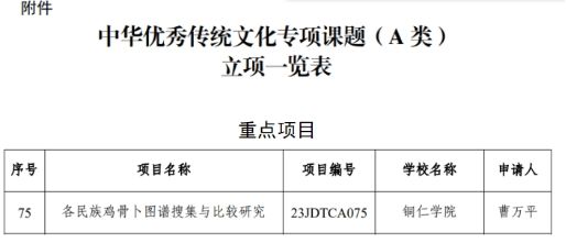 12月14日,《教育部社科司关于中华优秀传统文化专项课题(A类)立项的通知》(教社科司函〔2023〕102号)公布,我院教师曹万平申报的《各民族鸡骨卜图谱搜集与比较研究》(项目编号:23JDTCA075)获得重点项目立项。