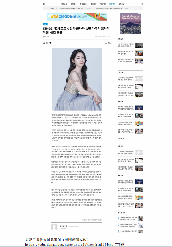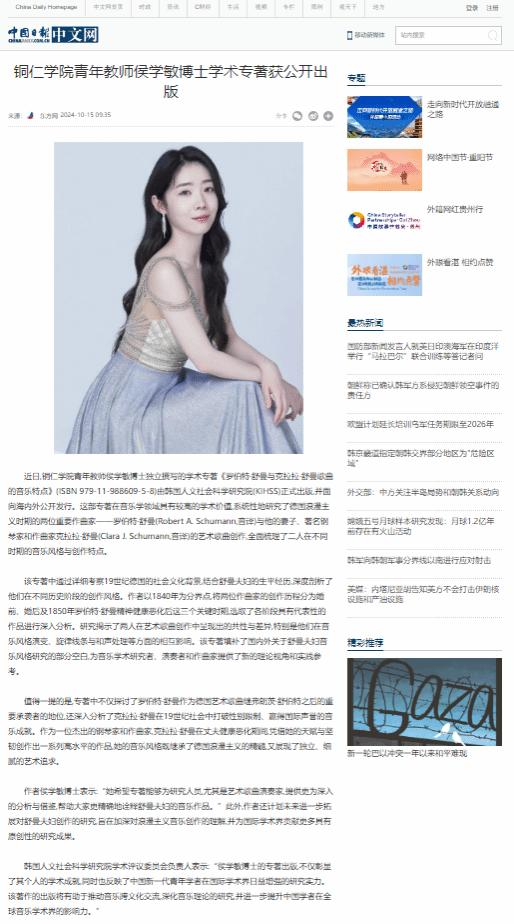 2024年10月,艺术学院音乐与表演系专任教师、青年博士侯学敏的韩国文专著《罗伯特·舒曼与克拉拉·舒曼歌曲的音乐特点》由韩国人文社会科学研究院(KIHSS)正式出版,面向海内外公开发行以来,随即得到了韩国东亚日报网、中华网及中国日报(海外版)等著名国际媒体的推介宣传。