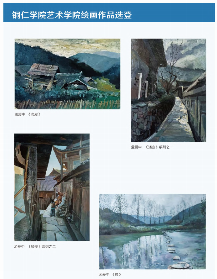 孟爱中老师的四幅作品分别是《老屋》《晨》《矮寨一》《矮寨二》。《老屋》以贵州常见的传统山间木瓦结构民居为主体意象,但该民居在建筑布局上一反传统,门高堂低。画面前部,木篱隔道、灌木排墙,草盖大门倾颓而耸,遮得门后房屋只露半截屋面,屋面白脊青瓦,规整端庄。整座房屋斜倚青山,侧抚山谷,谷中有物,隐约灿黄可收。谷向山缺,缺中望去,青山重重,渐远渐淡,头顶黄天稠云,覆盖无边。整幅作品,屋与青山,层层排开,前显后隐,各不相同,屋在山中,山形如屋,沉静黯淡而明光洒布,令人遐想,一见而有故乡之思、童年之念,渗出岁月静好、一去不返的悠悠哀伤。其它三幅亦以贵州山中常见之民居、巷道、河流田野等为表达意象,色彩运用与《老屋》精神一致,可谓是一组乡愁专题。