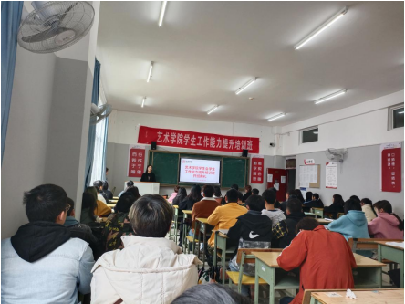 为了提高我院学生干部的工作能力,让我院学生干部注意外在形象、规范日常礼仪,树立良好的学生干部形象。艺术学院于4月6日中午,在美术楼206教室举行了艺术学院学生会学生工作能力提升培训班开班典礼,艺术学院党委副书记麻晔斐老师、学生发展科科长龙黎老师、教务科科长张少涛老师、团总支书记徐秋逸老师、党务科杨璐老师出席本次开班典礼,团总支学生会全体成员参加。本次典礼由龙正凤主持。