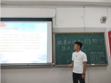 此次班会中,主持人首先向学生们介绍了改革开放40周年以来我国在经济、政治、民生、外交等领域进行了深层次的、根本性的变革,取得了全方位的、开创性的成就。让学生们解了改革开放以来,我国发生了翻天覆地的深刻变化。接着,主持人主要从以下八个方面来展开了详细的解释:一、我国经济发展水平不断提高,二、治国理政取得重大成效,三、社会民生不断改善,四、社会事业繁荣发展,五、基础设施建设卓有成效,六、科技创新成果大量涌现,七、生态文明建设取得积极进展,八、外交事业进一步发展。让学生们明白了只有更好的学习党的先进理论知识并结合自身实践,用自己所知所学帮助同学,回报社会,为中国梦的实现付出自己应尽的义务和责任。随后,各班辅导员就以上的八个问题向同学们发起提问并检测其学习的效果,同学们也都积极的回答了相应题目的问题。18美术学唐云云分享了自己的感言:“作为新时代的青少年学生要学会珍惜时间,刻苦学习,肩负起光荣的历史革命,提高素质,努力成才。”