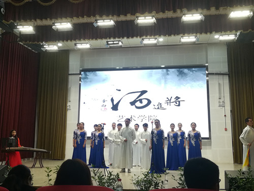 首先,大赛开始由主持人向在场同学们介绍本次比赛活动的规则。各院系代表队分别上台进行朗诵表演。我院代表队所朗诵的题目是《将进酒》,同学们慷慨激昂的朗诵表演,使得同学们感受到了诗人豪饮高歌,借酒消愁,忧愤深广的人生感慨。同学们语言流畅、感情充沛充分的表达了诵读作品的意境,台下的同学们也不时的报以热烈的掌声,为我院参赛选手增添信心。