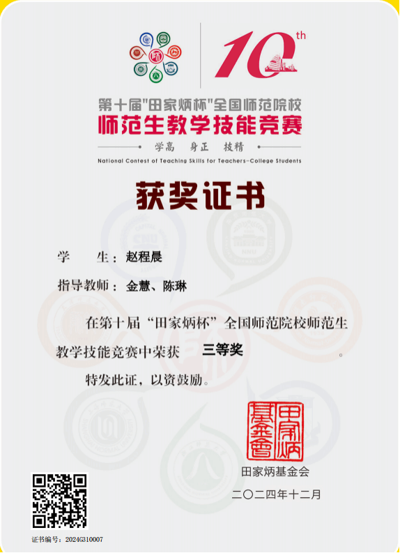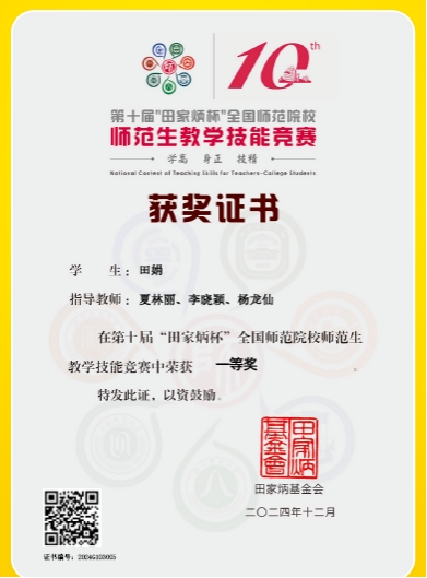 第十届“田家炳杯”全国师范生教学技能竞赛全国三等奖