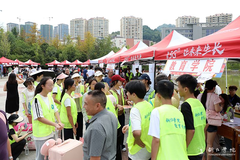 今年迎新工作主要在南大门和明德湖广场开展,现场布置井然有序。热烈欢迎2025级新同学”等标语鲜艳醒目,迎新帐篷分列整齐。各二级学院以及学生志愿者团队早早到位,热情等候每一位新生。2025级新生们带着对未来的期待与梦想走进校园,成为秋日铜院最动人的风景。