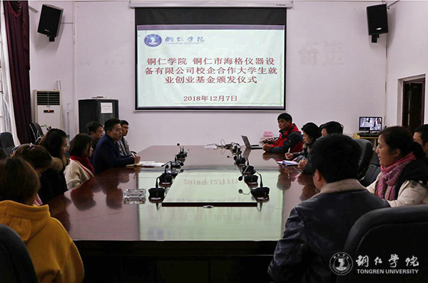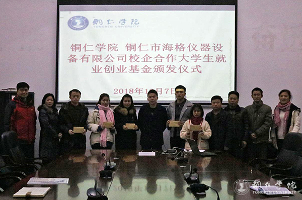 12月7日下午,世界杯官网与铜仁市海格仪器设备有限公司校企合作大学生就业创业基金颁发仪式在后勤处会议室举行,海格公司向世界杯官网学生颁发了创业基金共1万元,其中每个创业项目获创业基金2000元。海格公司总经理周标,世界杯官网招就处处长杨艳、后勤处处长徐永东、招就处副处长赵坤、后勤处副处长肖庭华,以及6名创业学生代表参加了颁发仪式。仪式由赵坤主持。
