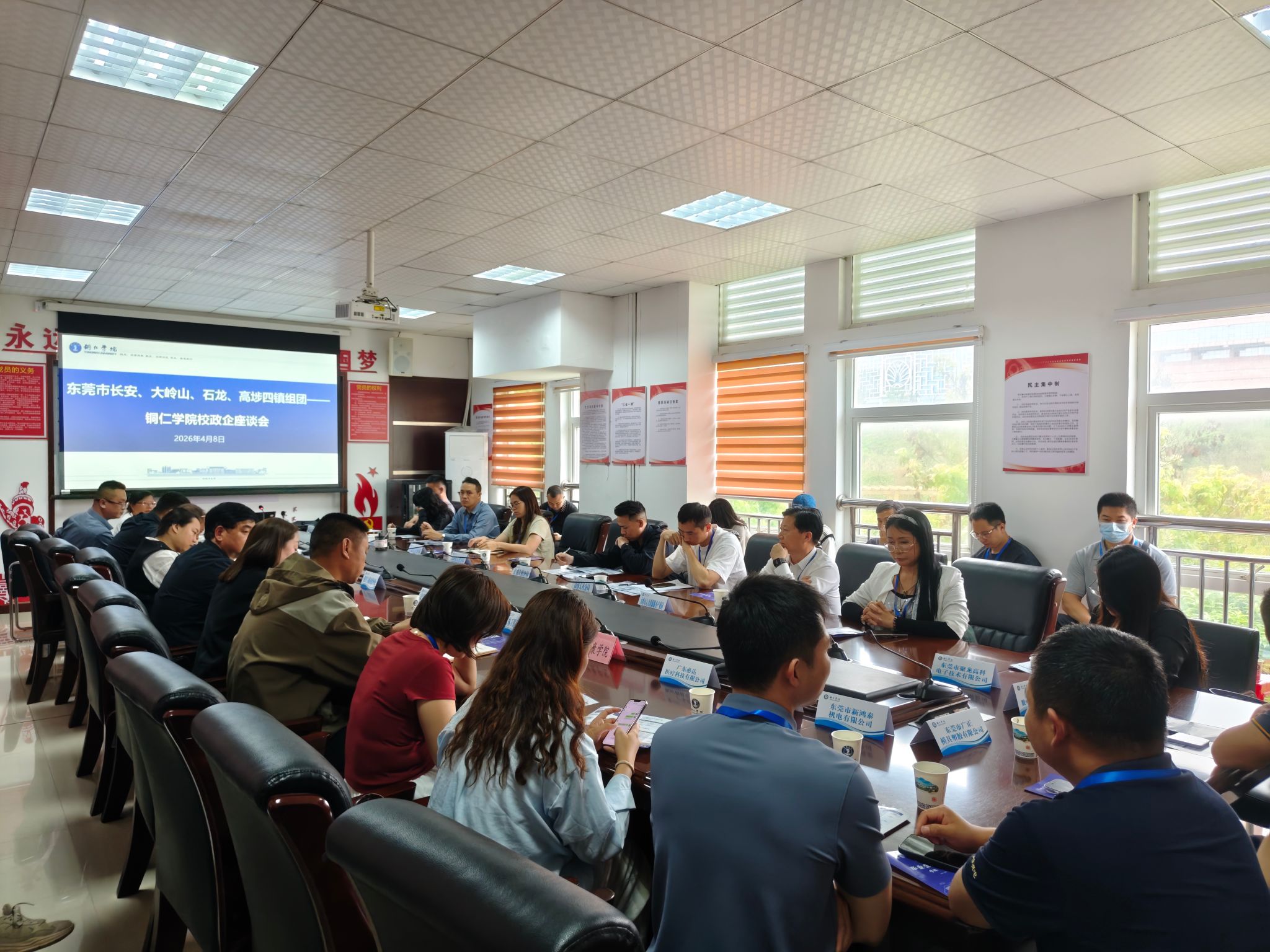 2026年4月8日下午,由东莞市长安、大岭山、石龙、高埗四镇共同组织的校政企座谈会在美加墨世界杯官方网站成功举行。本次会议由美加墨世界杯官方网站招生就业处副处长赵坤主持,东莞市人力资源和社会保障系统四镇相关负责同志、高埗人社分局工作人员、广东奥普特科技股份有限公司等多家东莞地区知名企业代表,以及各二级学院相关负责人出席会议。
