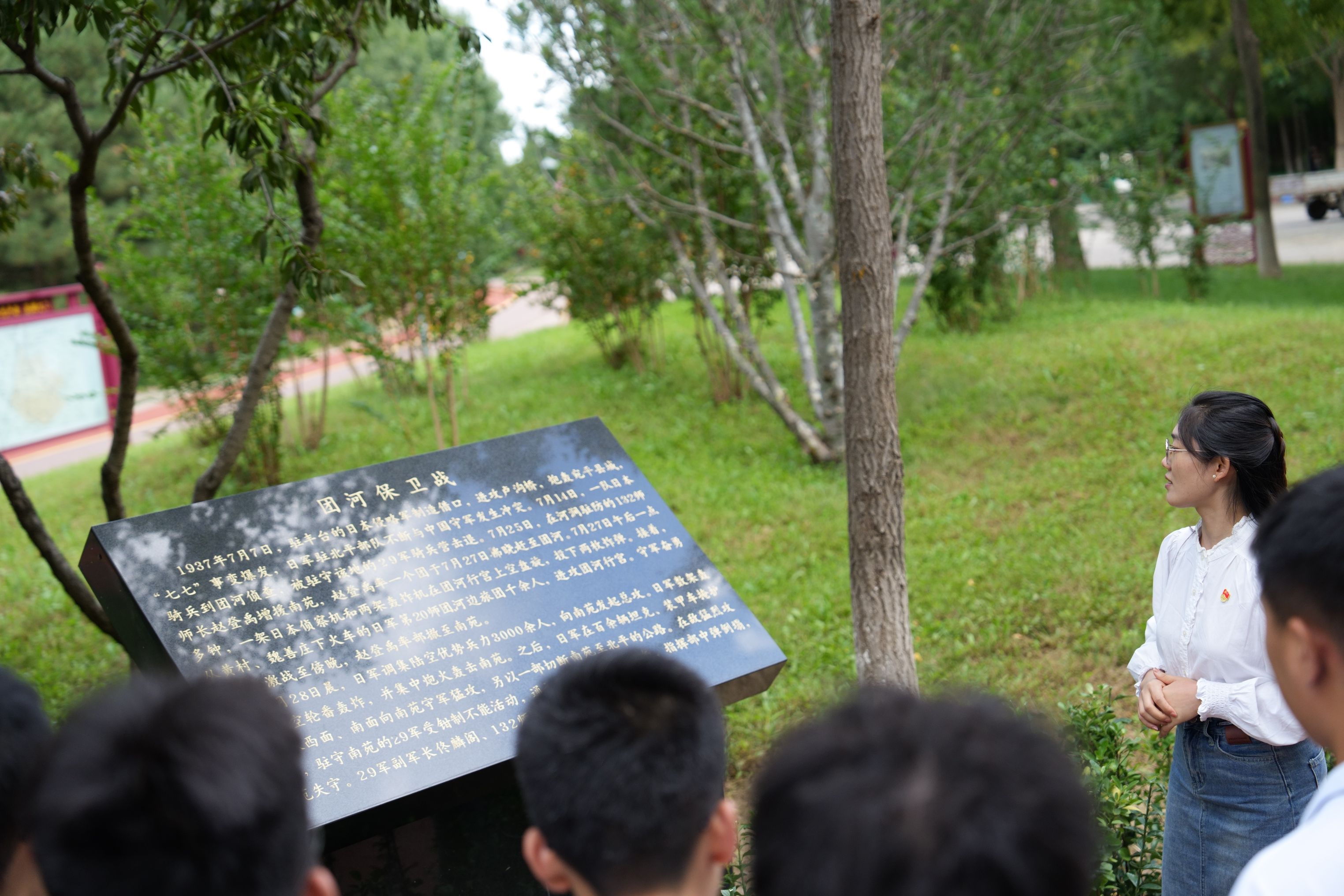 大兴区烈士纪念广场由大兴历史之路展板、烈士雕塑、英烈墙三部分组成。学生党支部书记徐洪芳为大家介绍了大兴地区的革命历史。