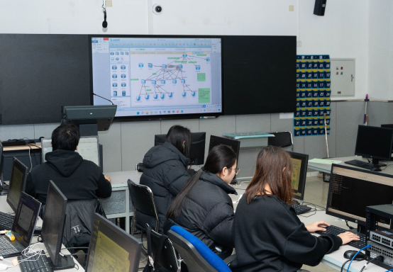209实训室为校企共建实训室,为北京电子科技职业学院与思科公司共同建设。思科公司是总部位于美国加利福尼亚州圣何塞的跨国科技巨头,专注于开发、制造和销售用于互联网通信的硬件、软件和服务。思科以其在网络技术领域的创新而闻名,尤其是在路由器和交换机市场占据主导地位。实训室内拥有8G以上内存、256G存储的计算机48台,还拥有包括思科和华为的路由设备、交换机、防火墙、入侵防御系统(IPS)等网络设备。丰富的网络硬件设备可以为学生和教师提供完善的实验环境。在实训室内,老师和学生可以复现出各种实际网络场景,完成网络相关知识的学习研究。