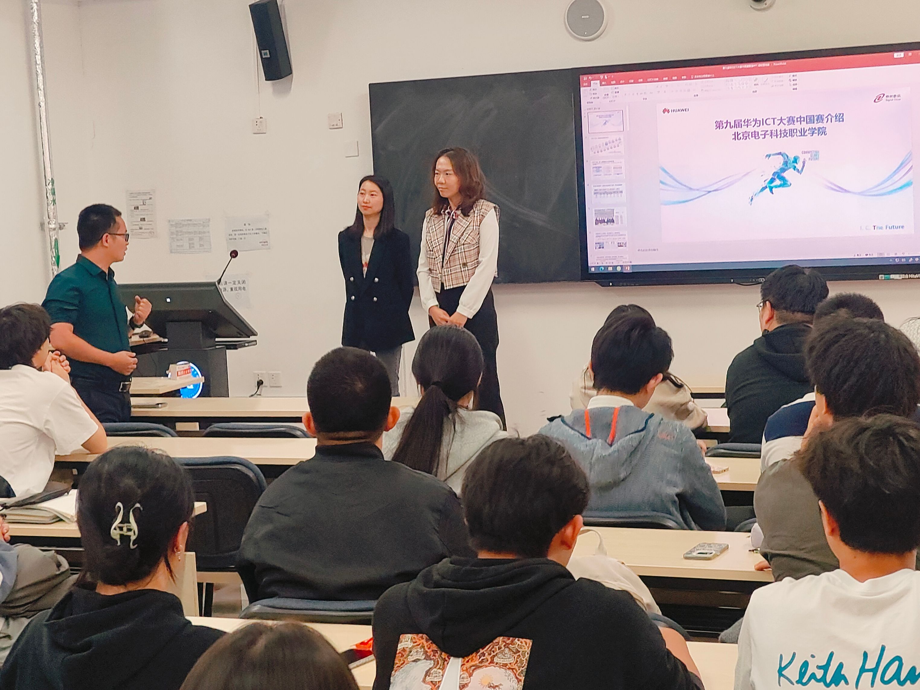 大赛专家为学生们介绍了华为ICT大赛的背景和意义,强调这是一个展示才华、提升技能、拓展视野和积累经验的宝贵机会。赵娜介绍了比赛的报名流程、奖项设置和积分奖励机制。华为ICT大赛的资深讲师与同学们进行了互动交流,解答了备赛中的问题和困惑,并分享了备赛技巧和经验。