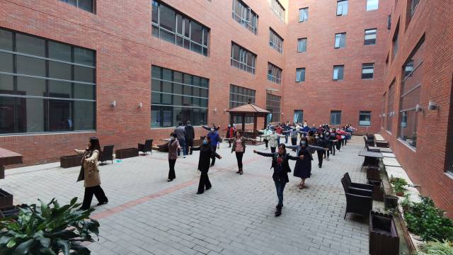 活动分为集体活动和个性化活动两个部分。首先,到校的全体教职工来到一层天井,大家集体完成了第九套广播体操。大家在整个过程中认真投入、精神饱满、动作整齐,展现出了良好的精神风貌。两遍广播体操结束后,老师们对坚持日常运动的必要性有了更深的认识。