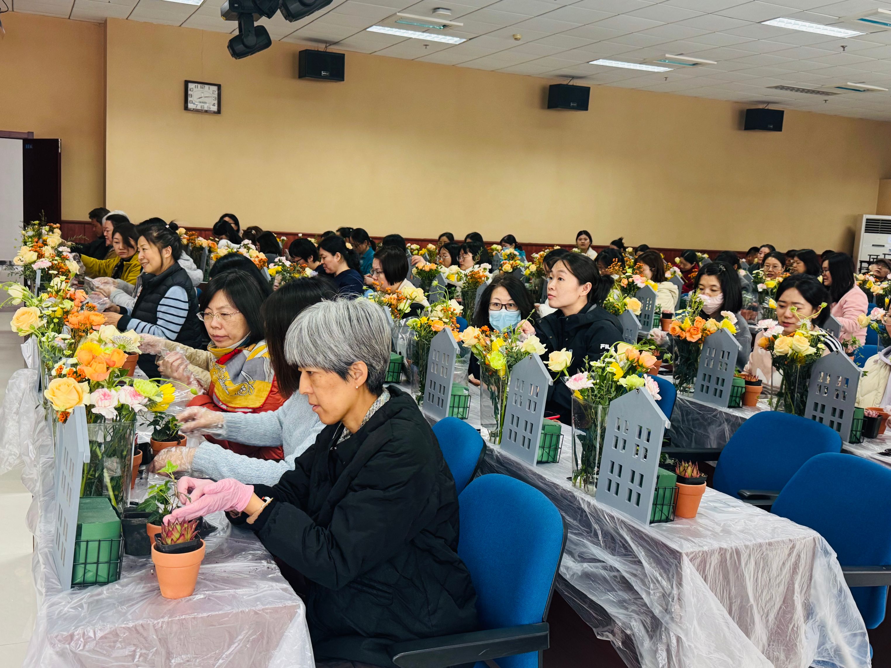 花香润心享雅趣,喜笑颜开花丛中,3月14日下午,校工会在学生活动中心报告厅组织女职工开展了“花样年华”插花活动,共有100余名女职工参加本次活动。在花艺老师的带领下了解花的特性,熟悉花的寓意,欣赏花的魅力,体验插花艺术。大家在欢声笑语中制作完成自己的插花作品,交流各自的插花设计,分享与花为伴的快乐。
