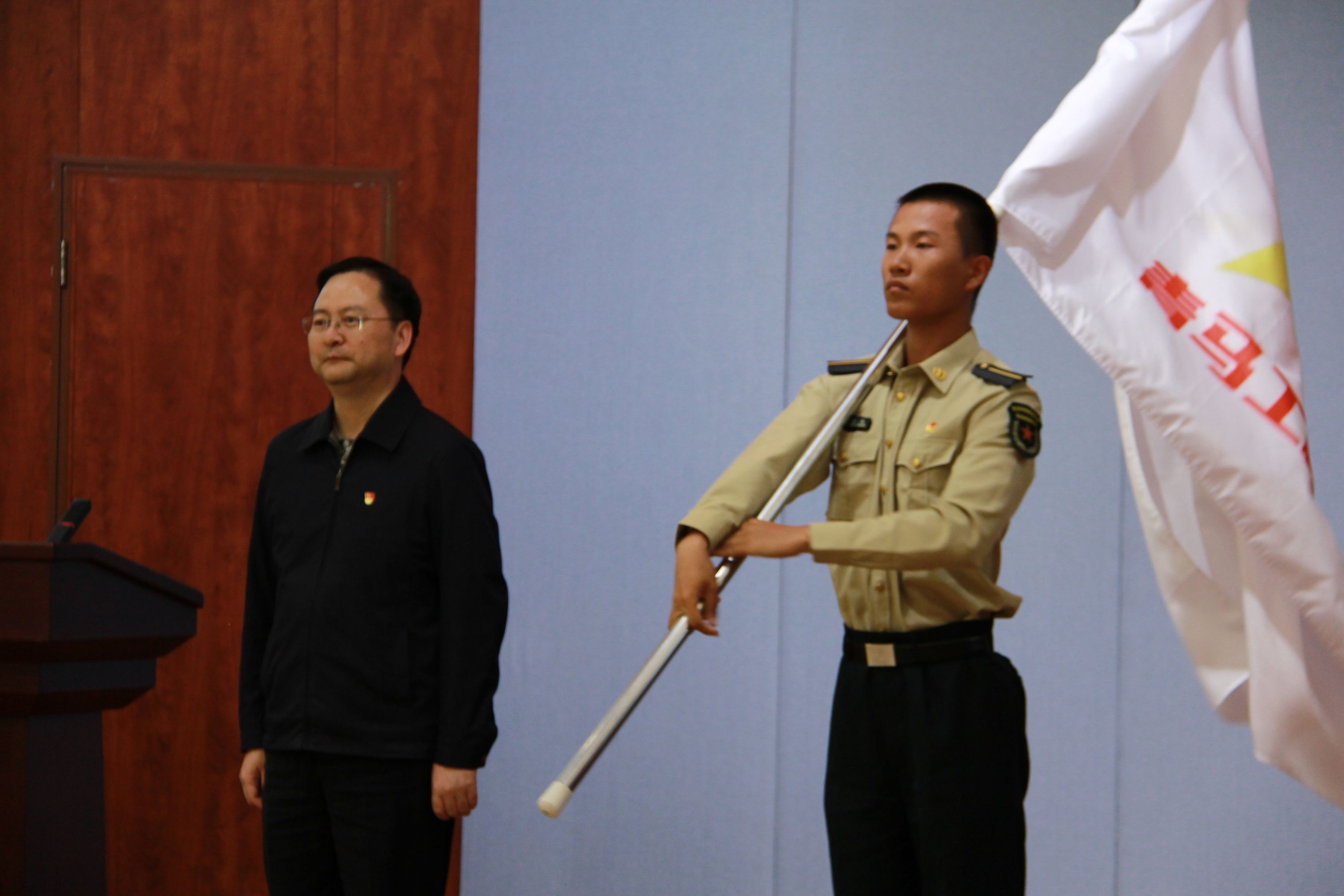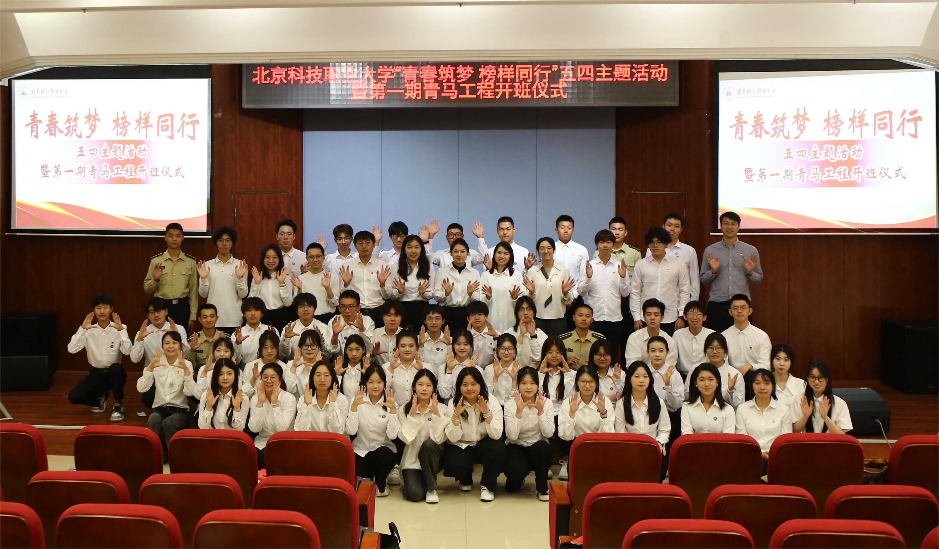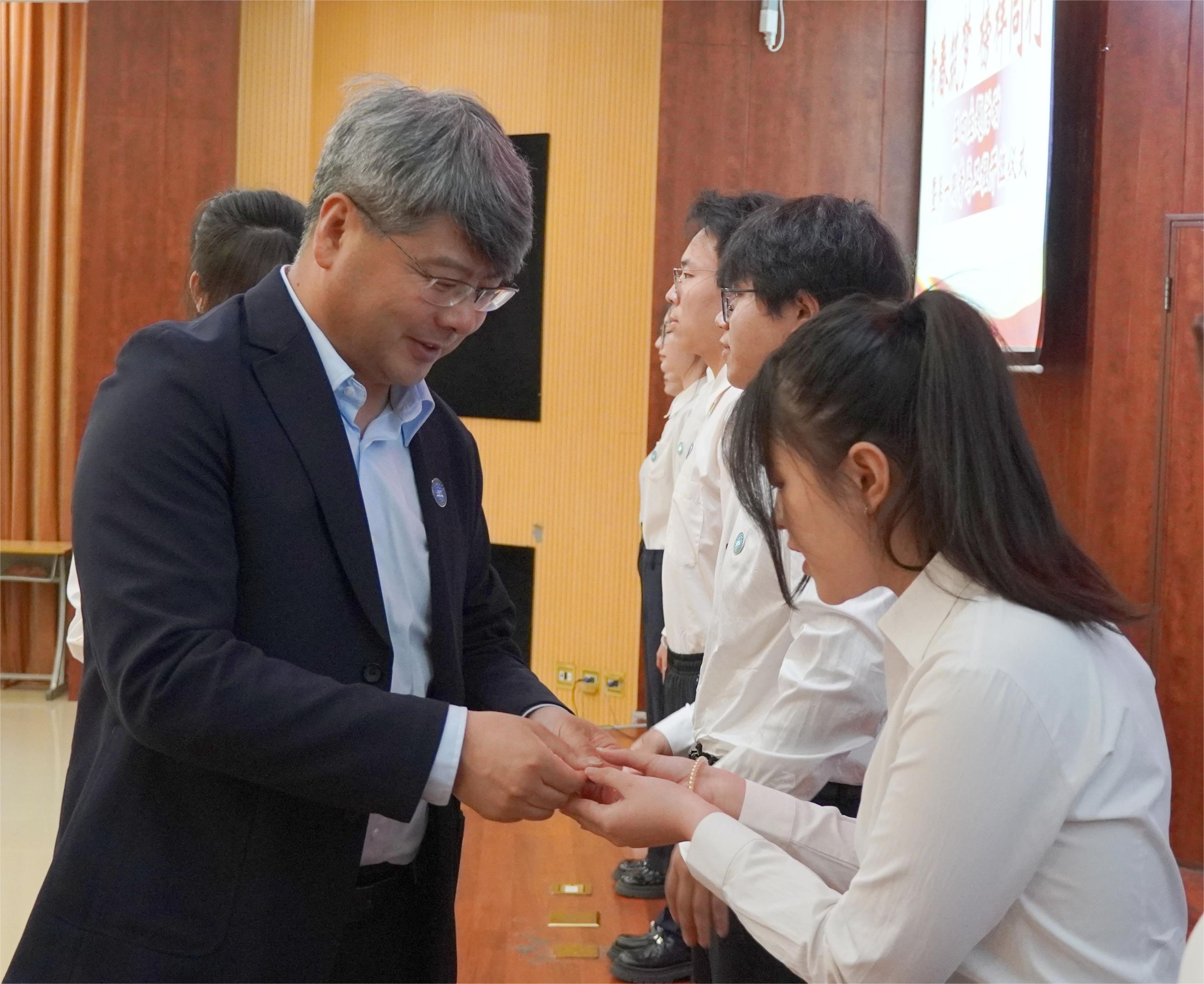 开班仪式上,王伟为学员代表佩戴新校徽,徐江波为青马工程授旗。校徽承载着“精融善新”的校训精神,旗帜凝聚着“强国有我”的青春誓言。徽章与旗帜交相辉映,象征着北职大青年坚定信仰,在新时代的征程上步履铿锵。