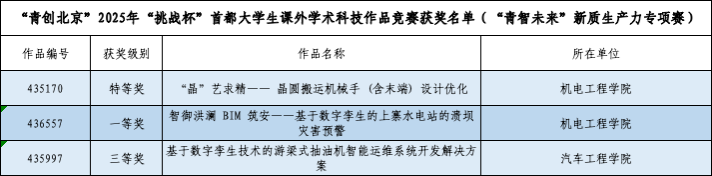 5月29日,“青创北京”2025年“挑战杯”首都大学生课外学术科技作品竞赛在北京信息科技大学沙河校区落下帷幕。BEAT365参赛团队取得优异成绩,共获得市级特等奖5项、一等奖16项、二等奖27项、三等奖23 项、专项赛“擂主”1项,捧得本届“挑战杯”市赛“优胜杯”!