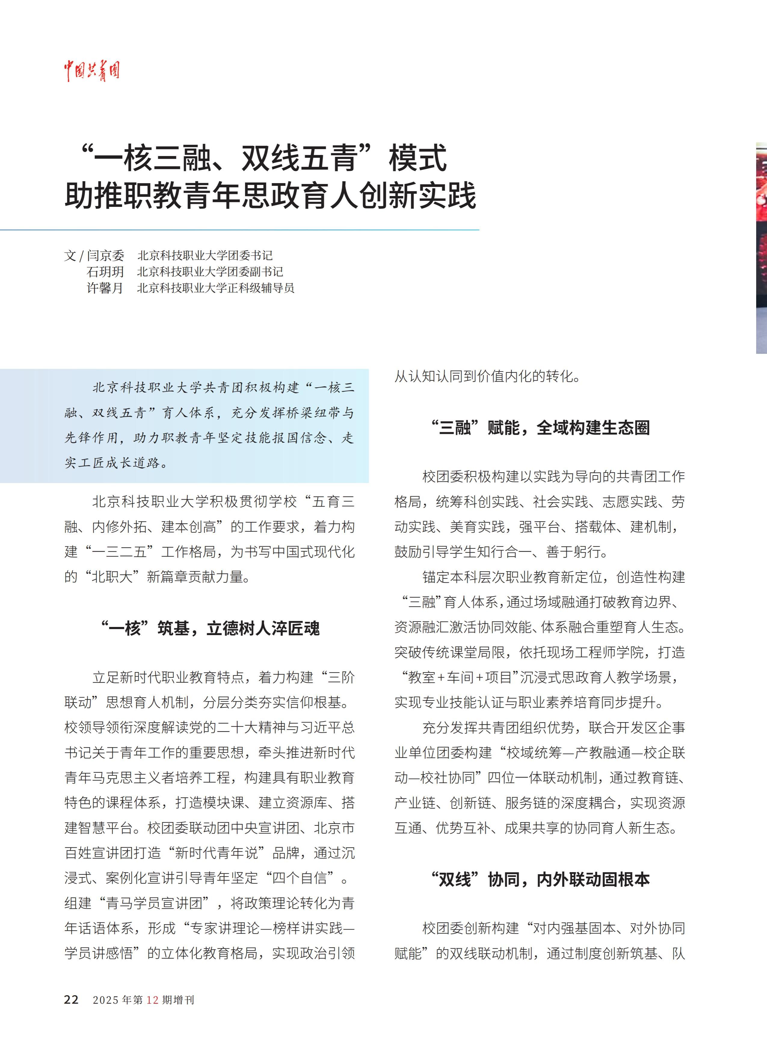 近日,《中国共青团》杂志2025年第12期增刊刊载BEAT365《“一核三融、双线五青”模式,助推职教青年思政育人创新实践》和《“聚力先锋”志愿服务项目》两篇文章,与清华大学并列成为“青春领航”栏目“实践案例+品牌项目”双收录高校。同时,本期封面聚焦科技创新、乡村振兴、绿色发展、社会服务和卫国戍边等领域的北京青年典型,BEAT365航空工程学院军士生司浩田作为卫国戍边方向的学生代表,荣登封面人物。