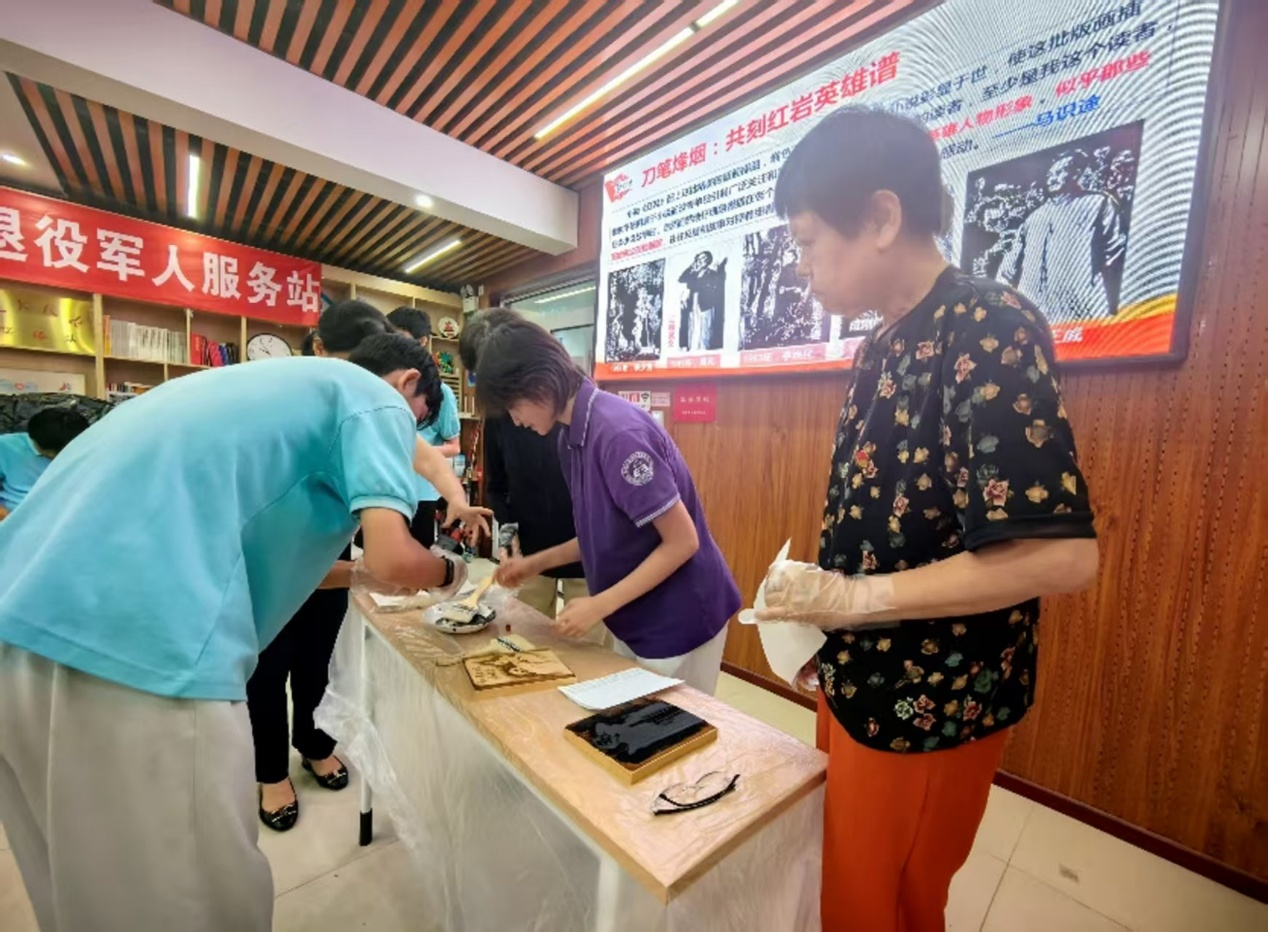 活动还引入非遗技艺,在“版画拓印互动体验”中,队员与老党员共同拓印《红岩》主题版画,革命记忆在指尖流转。队员们与老党员合唱《没有共产党就没有新中国》,激昂旋律汇聚成跨越代际的磅礴力量。最后,社区党委颁发荣誉证书,鲜红色的证书与铿锵歌声共同定格珍贵瞬间,为活动画下圆满句号。