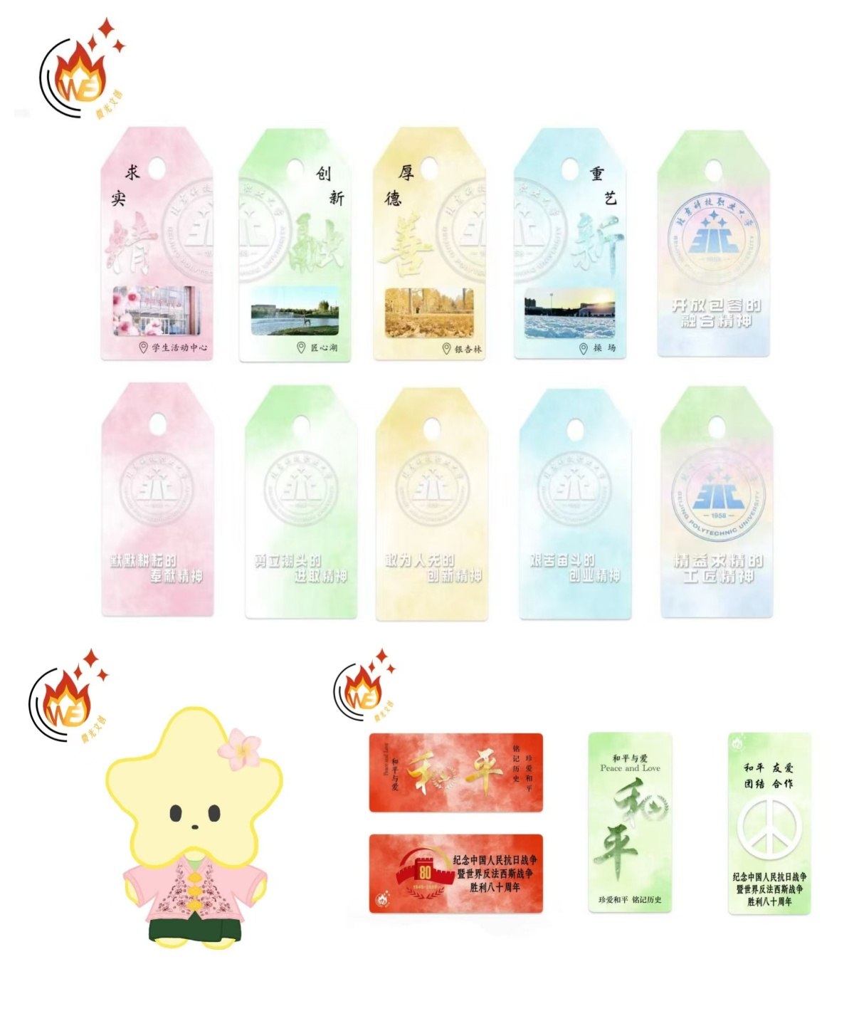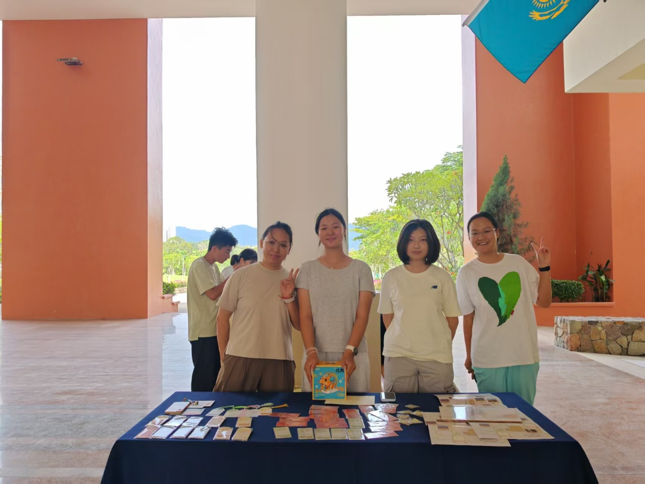 在马来西亚,实践团成员带着自主设计的文创产品走出国门,开启独特文化交流。为纪念抗战胜利八十周年,团队设计和平主题文创,绿、红色调卡片融入“和平”字样等元素,成为传递历史记忆与和平愿景的载体,吸引当地师生驻足。结合国际研学交流,打造的星星形象文创同样吸睛,头戴鸡蛋花、身着融合服饰的萌趣星星,凭借独特设计圈粉众多,成员借此分享文化碰撞故事,把中国青年对国际交流的思考、对不同文化的尊重,通过文创传递开来。此外,实践团打造校园四季书签传递校园文化。前四款常规书签以清新水彩色调,对应校园场景与精神,将校园片段与文化使命凝为符号。