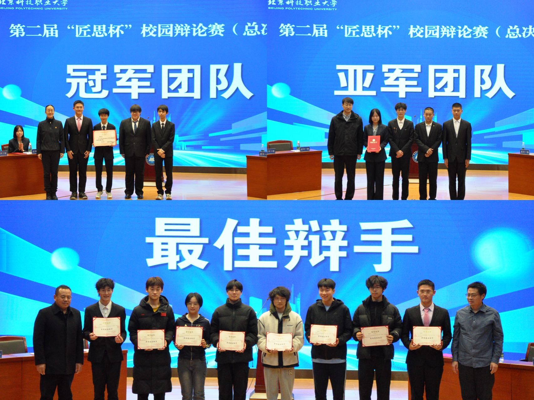 本届赛事历经初赛、半决赛与决赛三个阶段,经层层选拔与激烈角逐,集成电路学院(人工智能学院)代表队和航空工程学院代表队入围总决赛。总决赛围绕“时势造英雄还是英雄造时势”这一辩题展开。正方集成电路学院(人工智能学院)代表队立足历史脉络与社会发展规律,阐述时代背景对个体成就的关键影响;反方航空工程学院代表队则聚焦人的主观能动性与突破性贡献,强调杰出人物对历史进程的推动作用。双方在开篇立论、质询答辩、自由辩论等环节中展现出清晰的逻辑思维、扎实的知识储备与流畅的语言表达。最终,经评委团综合评议,航空工程学院凭借整体论述的系统性与感染力夺得冠军,集成电路学院(人工智能学院)获得亚军。