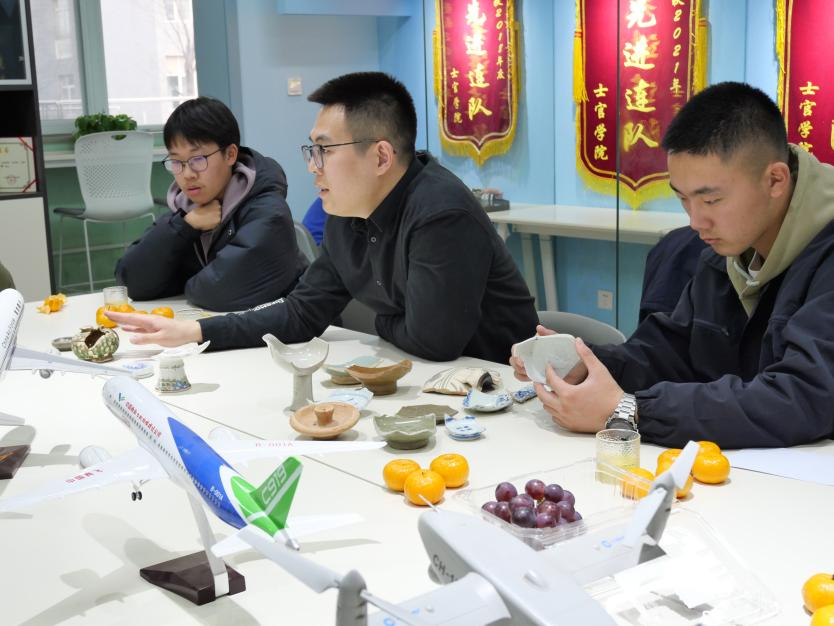 为增强师生对中国优秀传统文化的认同感和自豪感,12月6日,学校2014届毕业生吴帅受航空工程学院党团工作站的邀请,带领学弟学妹们“穿越”古代,一同学习中国陶瓷文化。为了加深同学们陶瓷学习体验,吴帅学长特意带来了瓷器实物,供大家观察和学习。