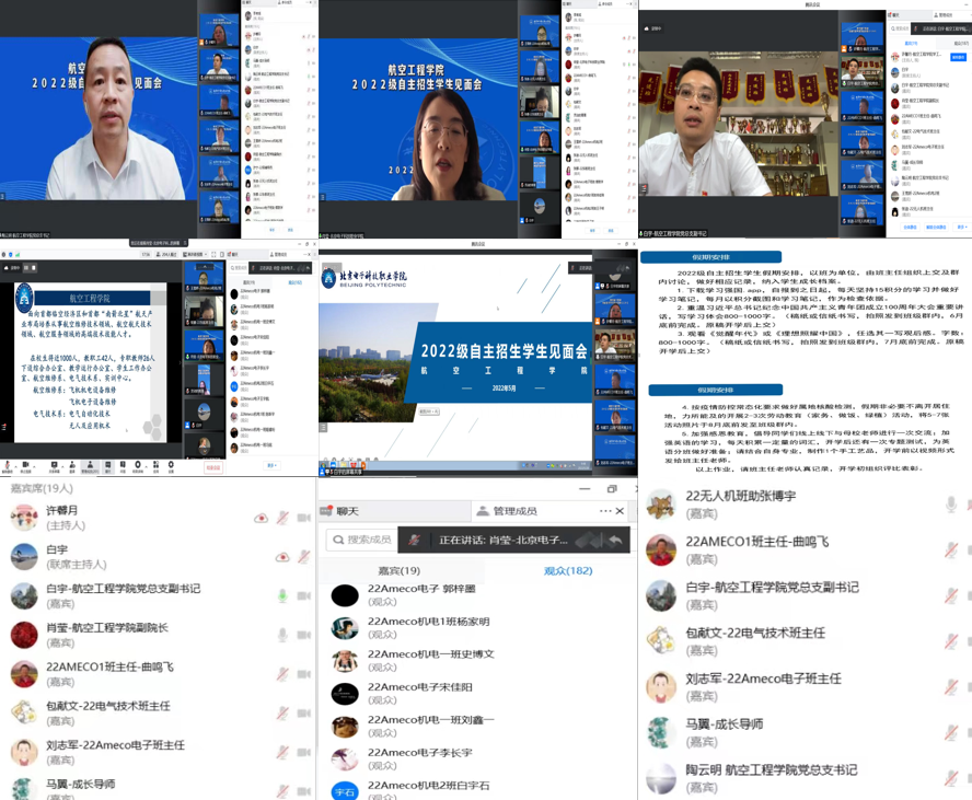 5月28日上午,航空工程学院2022级自主招生学生见面会准时在云端与大家相会,参加本次见面会的有航空工程学院党总支书记陶云明老师,党总支副书记白宇老师,副院长肖莹老师,学工办主任、学生党支部书记许馨月老师,新生班班主任、辅导员及全体201名新生。会议由白宇老师主持。