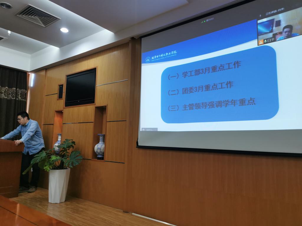 白宇老师结合学校学工例会会议精神,在从落细落实开学准备,严抓学生考勤、疫情防控常态化管理、精心开展安全稳定教育、用心筹备主题班团会、关心关爱“四困”群体、做好贫困生帮扶、全员参与招生宣传等方面,对新学期开学初的学生工作进行了具体安排。