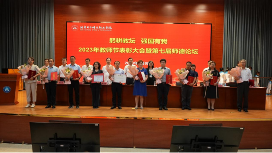 选宣榜样典型,树立师德师风高尚旗帜。选拔优秀教师、优秀教育工作者和师德先锋典型,召开教师节表彰大会和师德论坛活动,展示在教学改革、技能大赛、科技创新等各个领域做出突出贡献的教师事迹。目前拥有全国优秀教师6人,全国五一劳动奖章获得者2人;教育部新时代职业学校名师1人、课程思政教学名师14人。