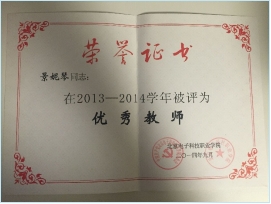 在今后的几年,继续精进教学技能,多次带领学生参加比赛。在2012年参加学院的青年教师基本功比赛荣获最受学生欢迎奖,2014年荣获北京市大学生设计竞赛“优秀辅导教师奖”,荣获2013-2014优秀教师,2015年在“如何上好第一次课”说课比赛中荣获二等奖。2016年指导学生完成“基于MSP430单片机的便携式电磁检测辐射仪”项目,参加全国挑战杯创新创业大赛荣获二等奖。