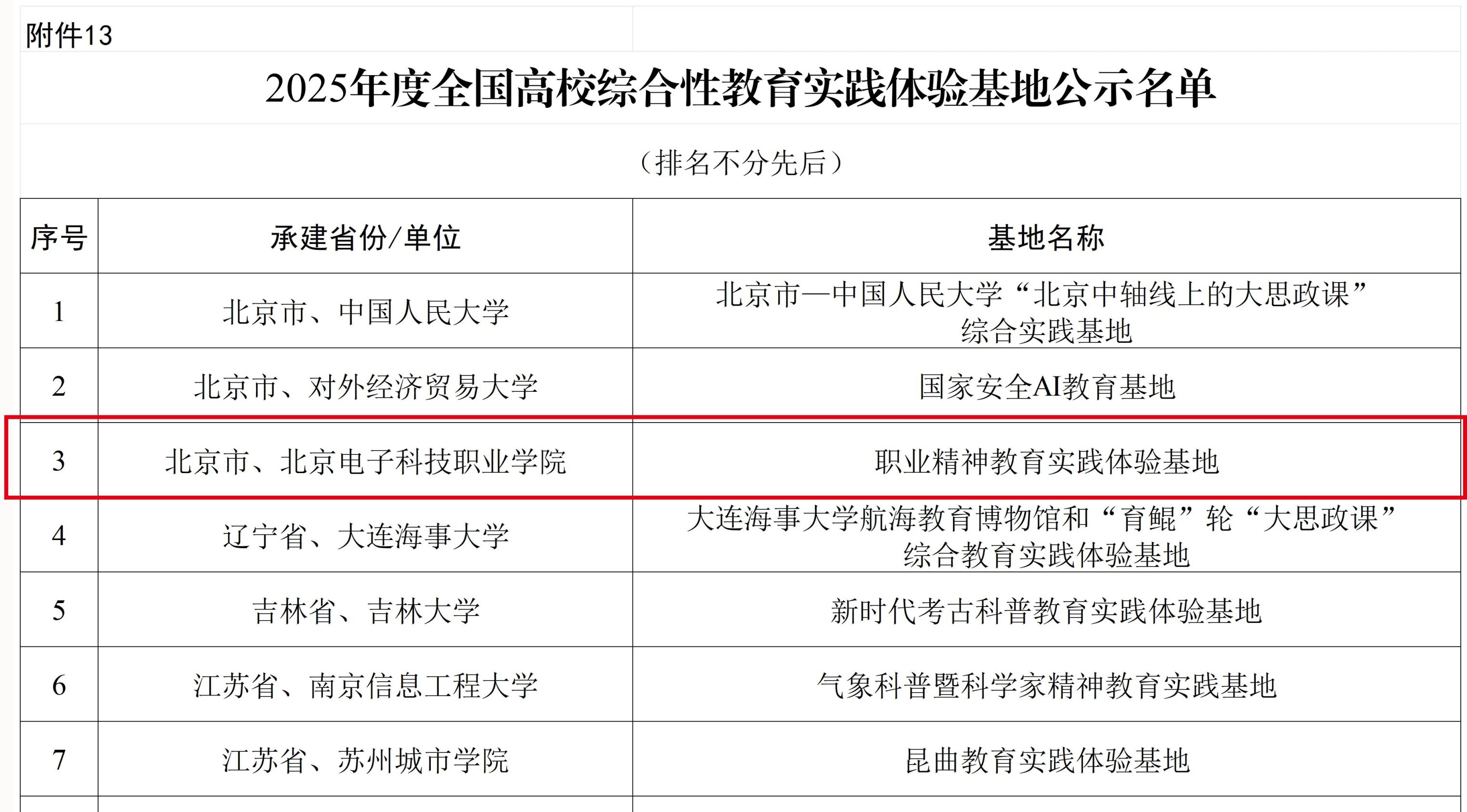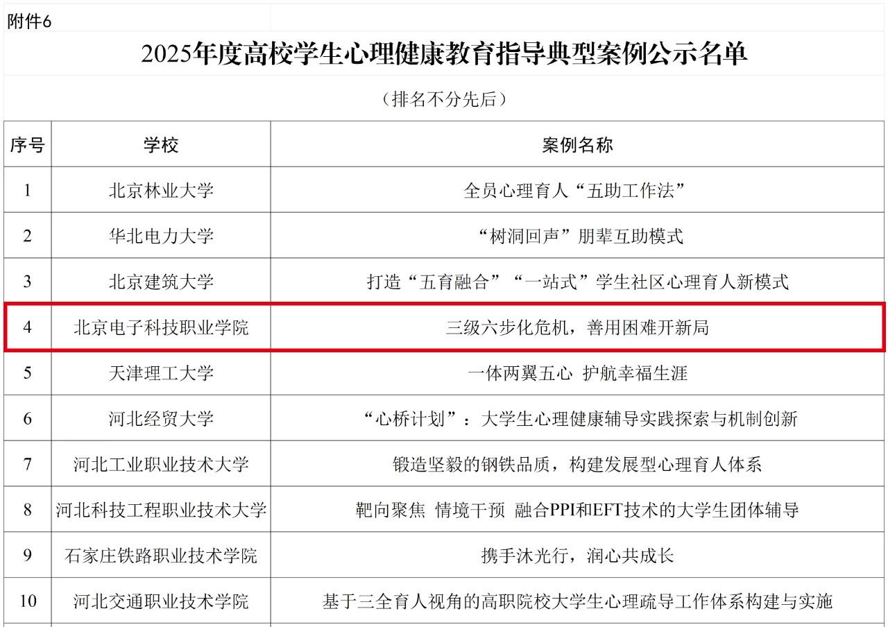 近日,教育部办公厅公布了2025年度高校思想政治工作质量提升综合改革与精品建设项目入选名单。学校申报的《职业精神教育实践体验基地》入选2025年度全国高校综合性教育实践体验基地,《三级六步化危机,善用困难开新局》案例入选2025年度高校学生心理健康教育指导典型案例。这是学校继2024年获批实践育人精品项目后再次成功入选,实现了在这一国家级项目上的新突破。