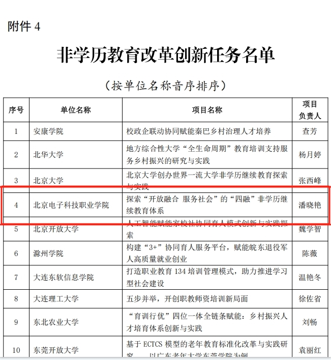 2月17日,教育部职业教育与成人教育司公布了2024年学习型社会建设重点任务(高等继续教育领域)培育建设名单,学校航空工程学院的“航空维修三教统筹协同创新实践中心”项目入选三教统筹协同创新任务名单,继续教育学院的“探索‘开放融合 服务社会’的‘四融’非学历继续教育体系”项目入选非学历教育改革创新名单。