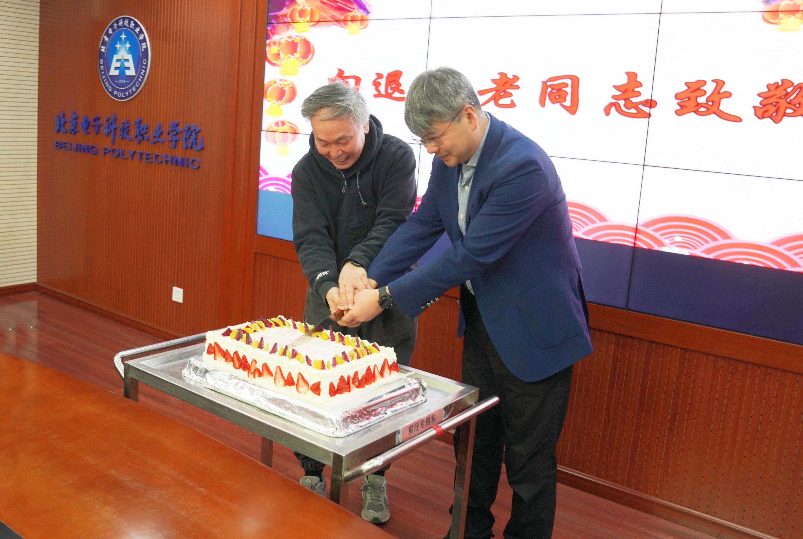 王伟与退休教职工代表尹大川共同切分荣退蛋糕,与会人员共同分享了这难忘的时刻。