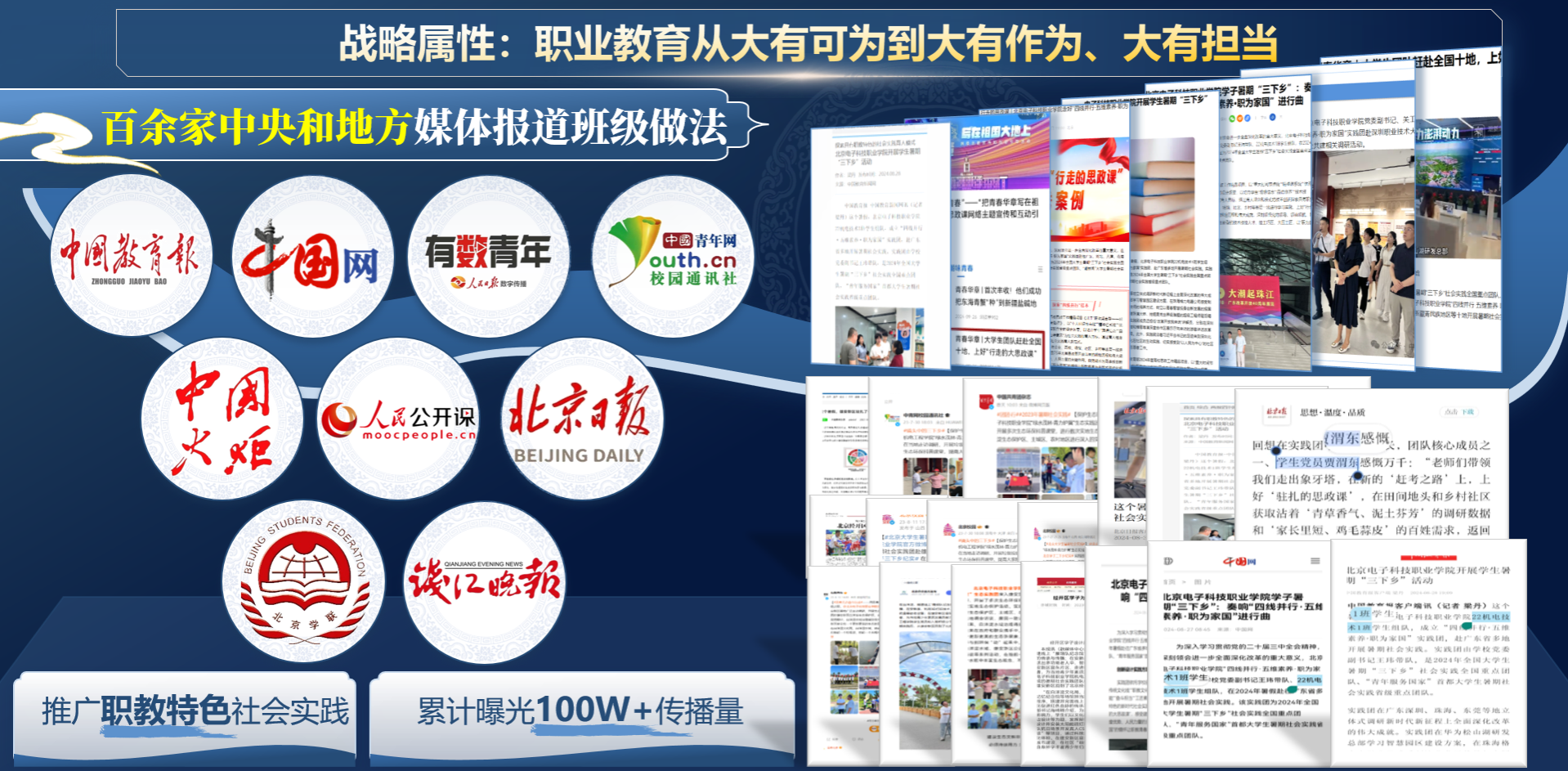 班级成员积极参与学生党支部活动,与国家部委和地方单位共同开展党性实践,获得北京高校红色“1+1”高职院校唯一的一等奖。班级同学连续两年代表全国职业院校服务全国两会并获表扬信,同时负责世界机器人大会的服务保障,服务北京市委、市政府领导的场景被媒体宣传报道。班级成员积极服务区域经济社会发展和学校职业本科事业发展,在校三年志愿服务时长超4200小时,推动学校社会实践向多领域、多模式发展,行程遍布4个国家、超40000公里,探索出对实践成果进行转化升级的首都职教模式,获得了教育部、团中央、市委教工委等各级单位的表彰鼓励,多个荣誉为北京高职院校唯一获得的成绩。中国教育报、中国网等百余家中央地方媒体也报道了班级的实践做法,向全国推广了班级实践育人的特色模式,彰显了职教青春的大有可为和大有担当。