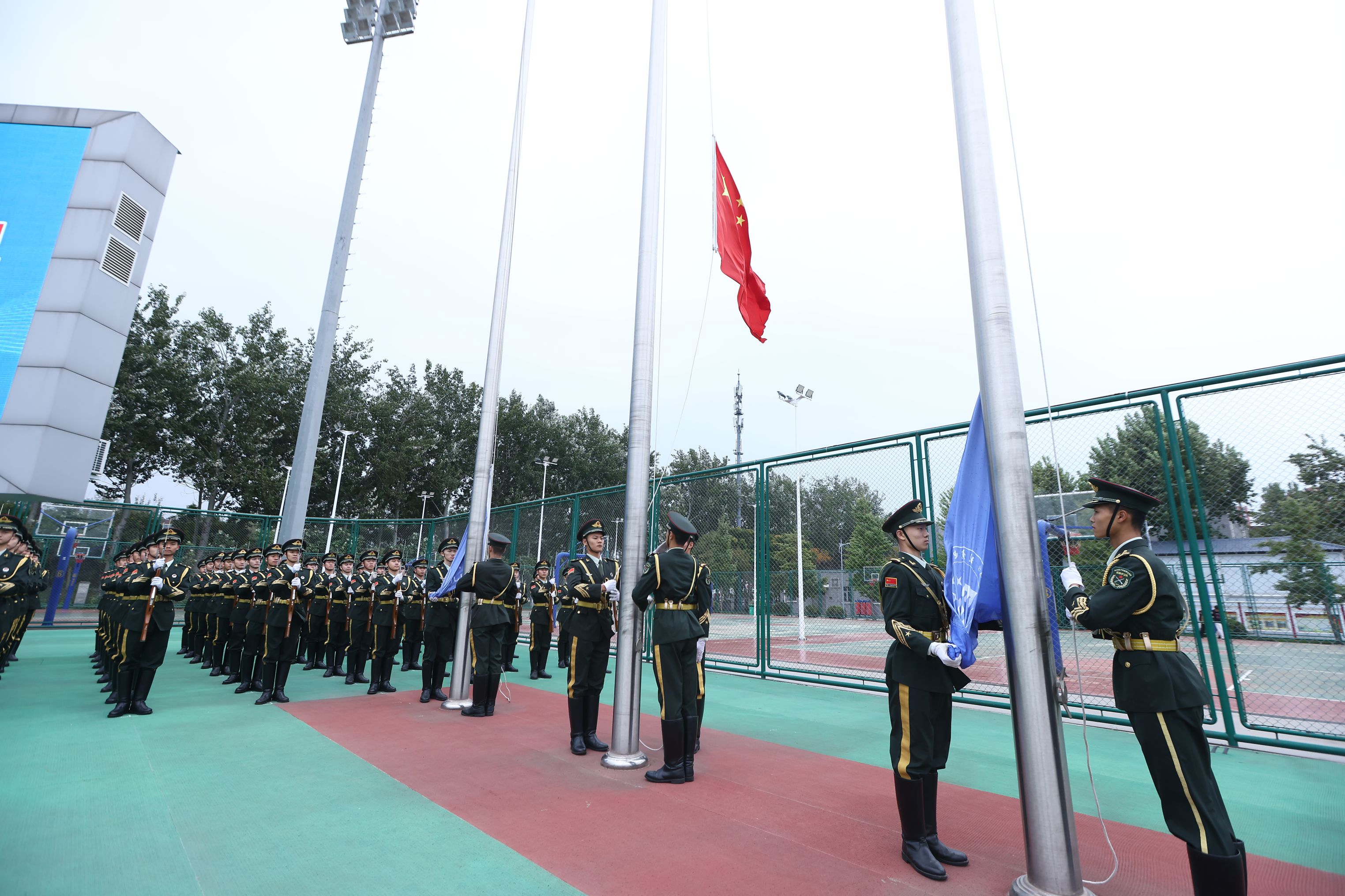 雄壮激昂的国歌声响起,在全体师生的深情注目下,鲜艳的五星红旗冉冉升起,迎风飘扬。