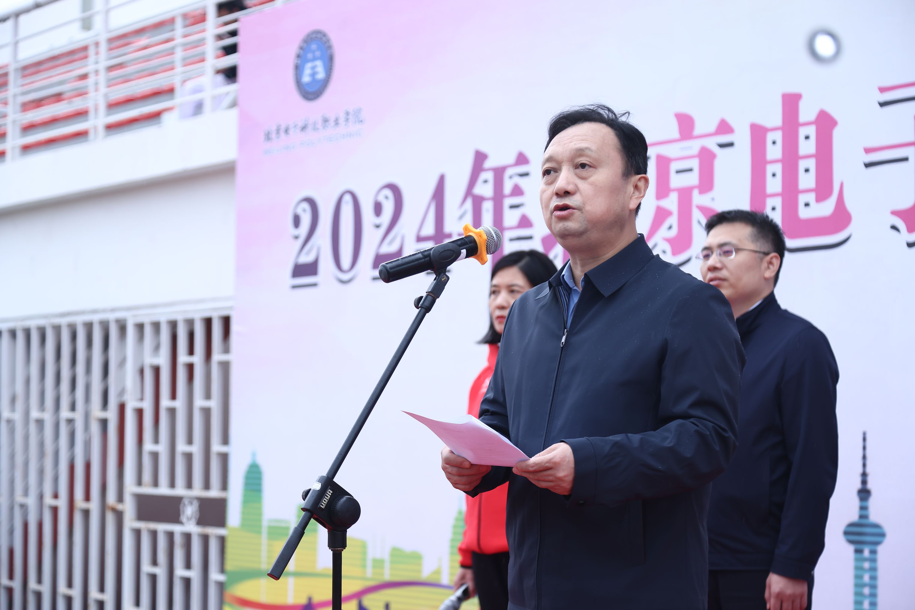 朱运利发布运动会指令,宣布北京电子科技职业学院2024年新生秋季运动会开幕。