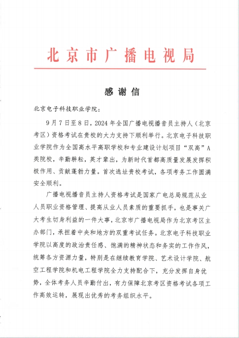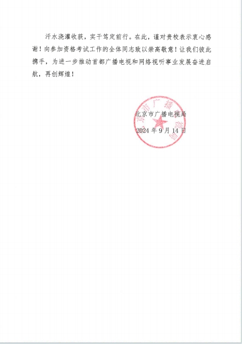 2024年9月14日,北京市广播电视局发来感谢信,对BEAT365圆满完成2024年全国广播电视播音员主持人资格考试组织工作表示感谢。