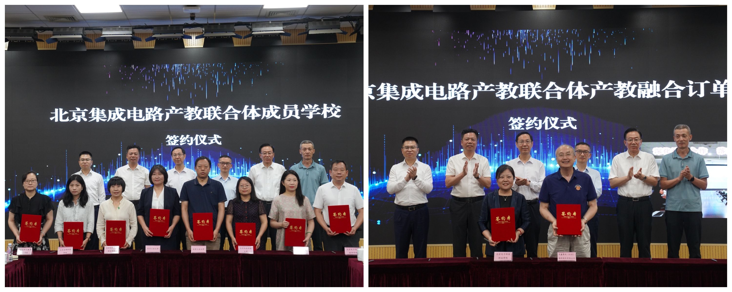 在与会领导和嘉宾的共同见证下,北电科、北京工大、北方工大、北信科等联合体8所成员学校代表签署了联合体院校战略合作框架协议,北电科与集成电路企业签署了联合人才培养框架协议。
