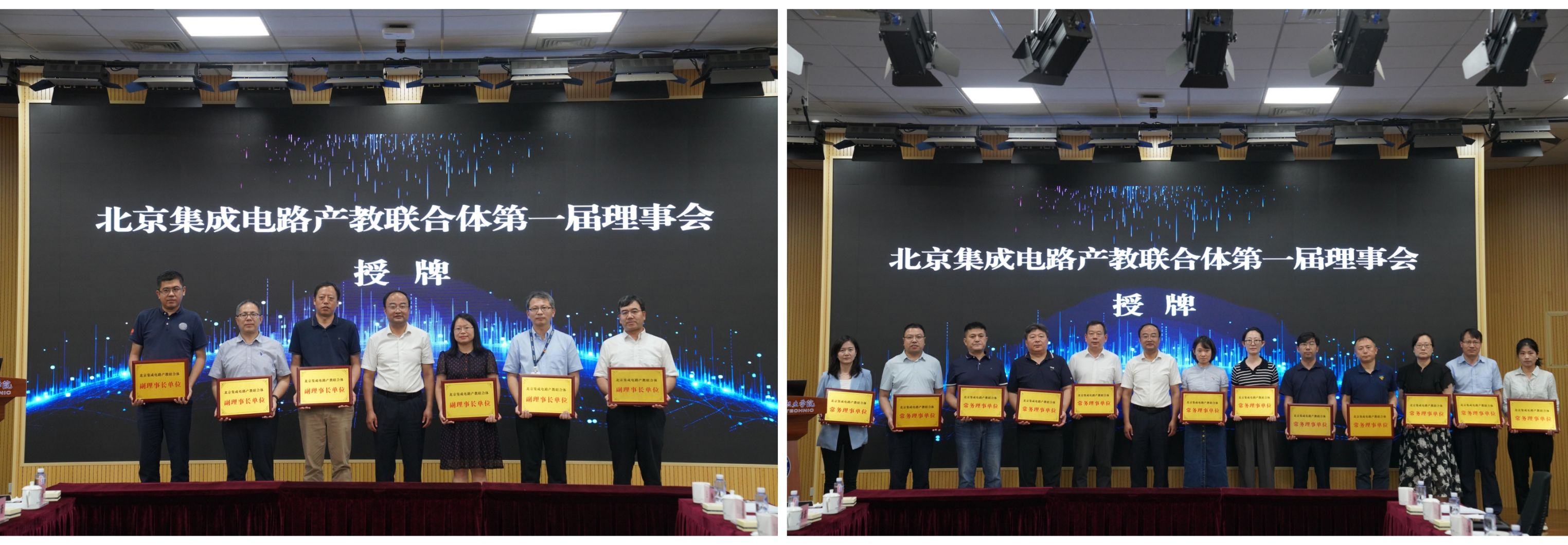 会议第二阶段召开了联合体第一届理事会会议,辛秀兰主持会议。会上通过了《北京集成电路产教联合体章程》,选举北方工大为第一届轮值理事长单位,北方工大党委常委、副校长陈群教授为理事长,选举了副理事长、常务理事,以及联合体秘书处秘书长和副秘书长等人员。选举完成后,对各单位进行了授牌。