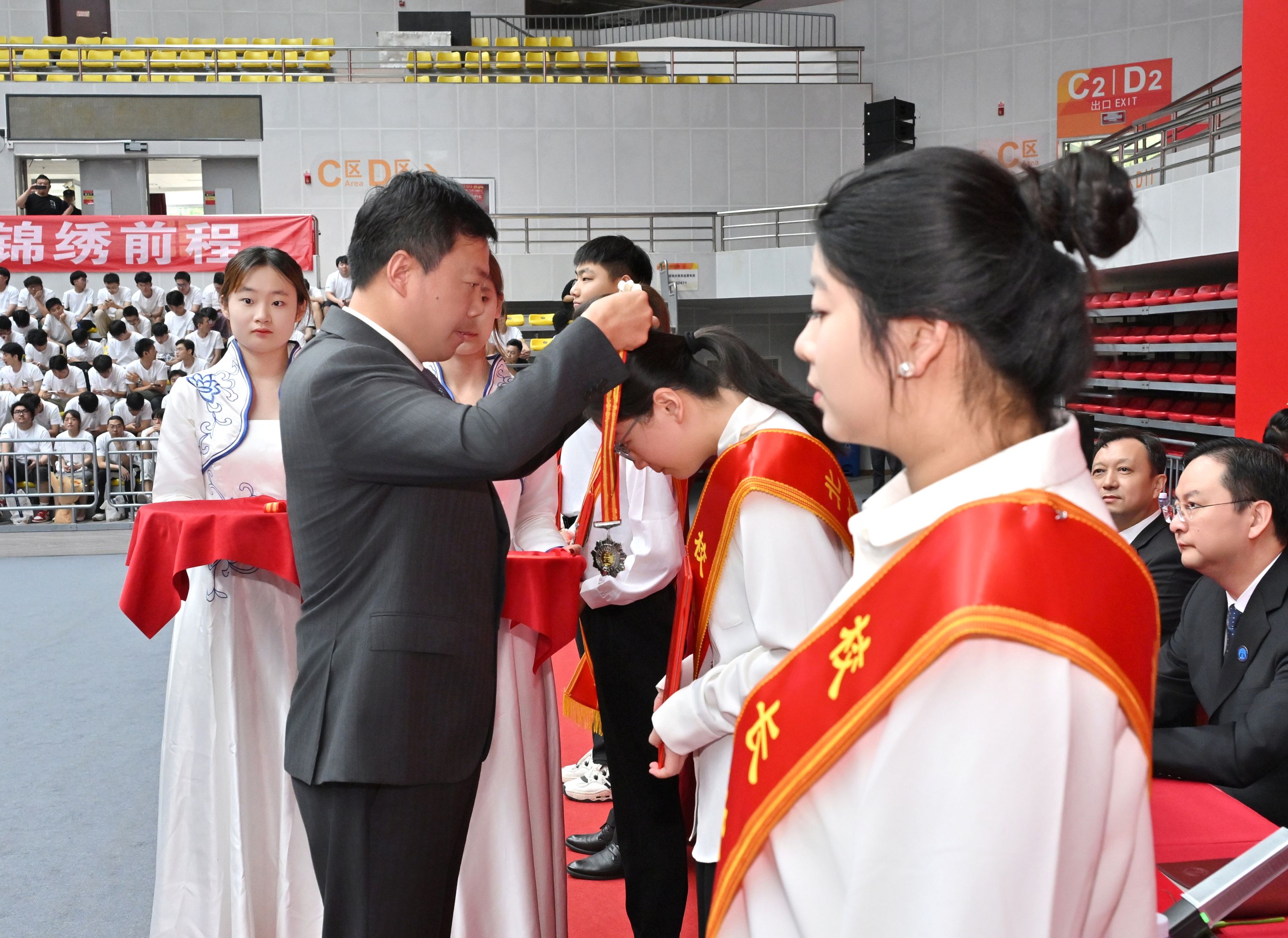 学校领导为毕业生代表颁发毕业证书、北京市优秀毕业生荣誉证书、校友联络员聘书。