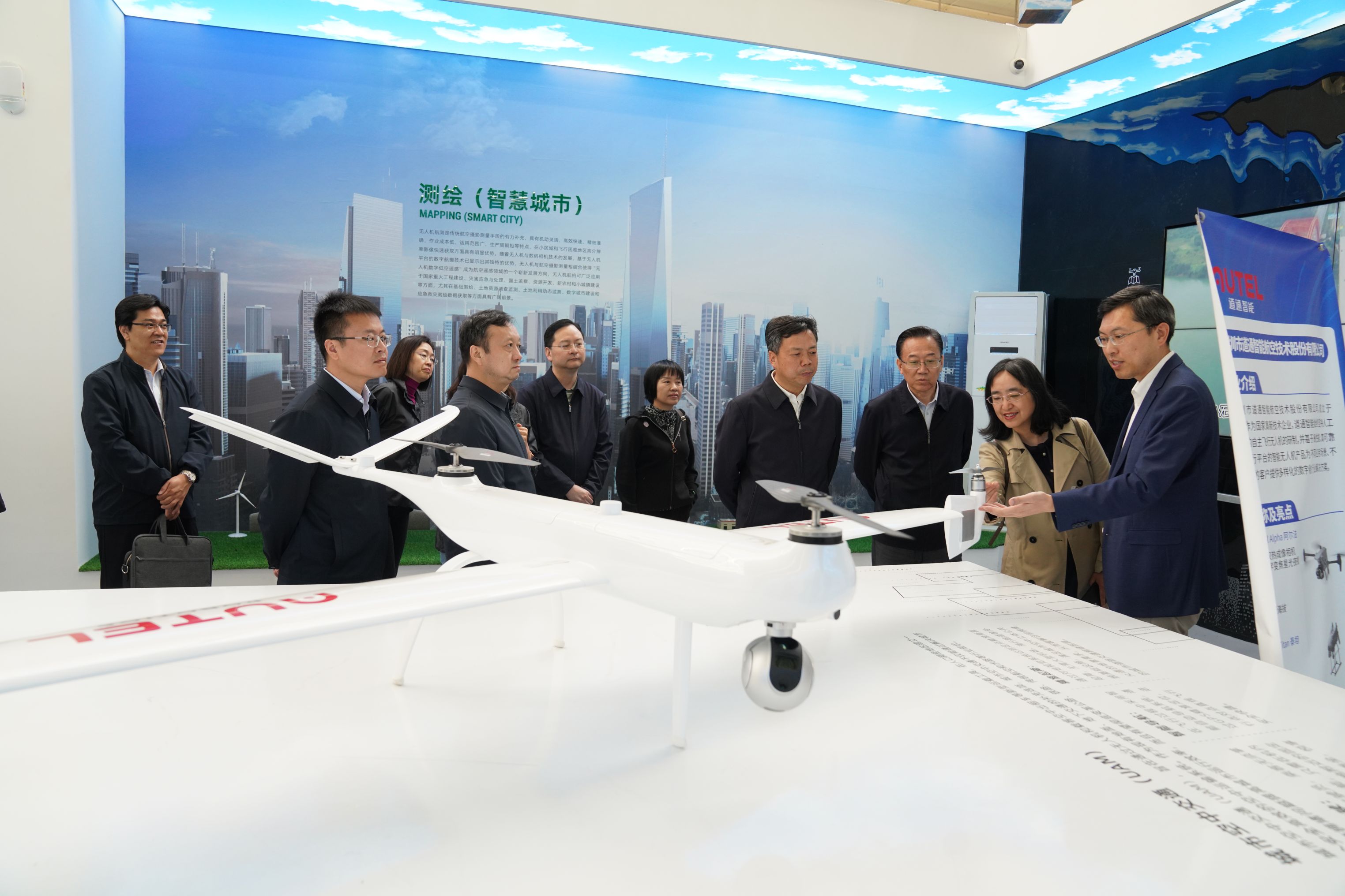 在延庆区区委书记于波,区委常委、副区长、中关村延庆园管委会主任苏礼华的陪同下,中心组成员一行首先来到北京市无人机科技馆,参观中关村延庆园产业规划数字沙盘,深入了解中关村延庆园产业发展整体情况。在展厅内,中心组成员一行详细了解了无人机发展史以及近年来无人机发展概况,参观了多种无人机机型及相关设施设备,近距离感受科技自立自强,面对面体验科创魅力。