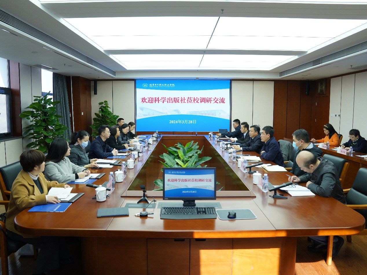 科学出版社职教技术出版中心、电子信息分社、经管分社、农林生物编辑部、北京片区等相关部门负责人,以及学校学生工作部、教务处、科技处、经济管理学院、艺术设计学院、基础教育学院等相关单位负责人一同参加调研。