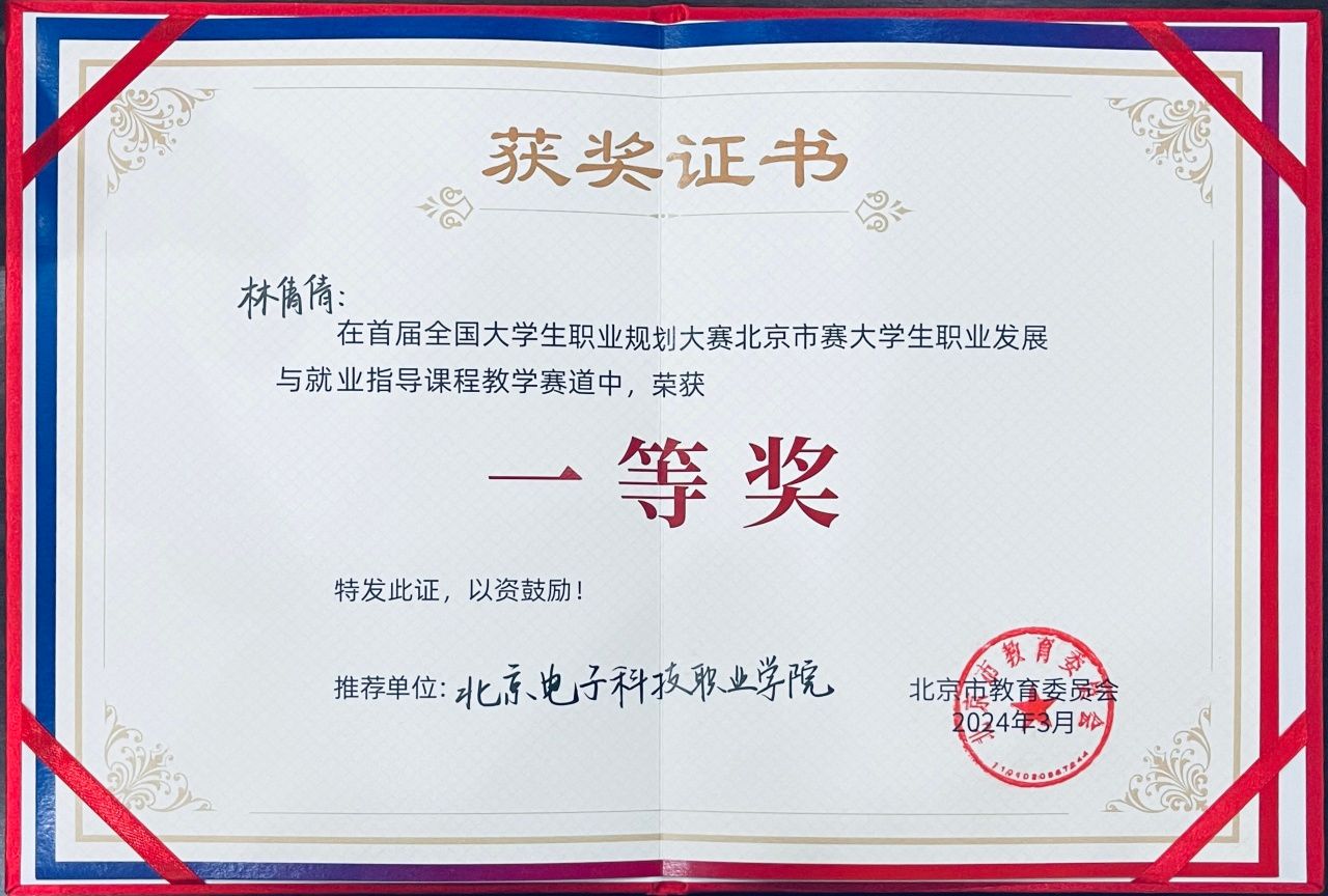 决赛分为课程建设情况汇报、互动答辩、教学或指导情景模拟三部分。决赛现场,林倩倩代表BEAT365教师团队顺利完成汇报和互动答辩,并对现场模拟的实际问题进行了有效精准指导,展现出扎实的理论知识、熟练的辅导技能、过硬的素质能力和良好的精神风貌,赢得现场专家及师生的热烈掌声。最终凭借优异表现,荣获首届全国大学生职业规划大赛北京市赛教学赛道一等奖,同时取得了直通国赛的资格。