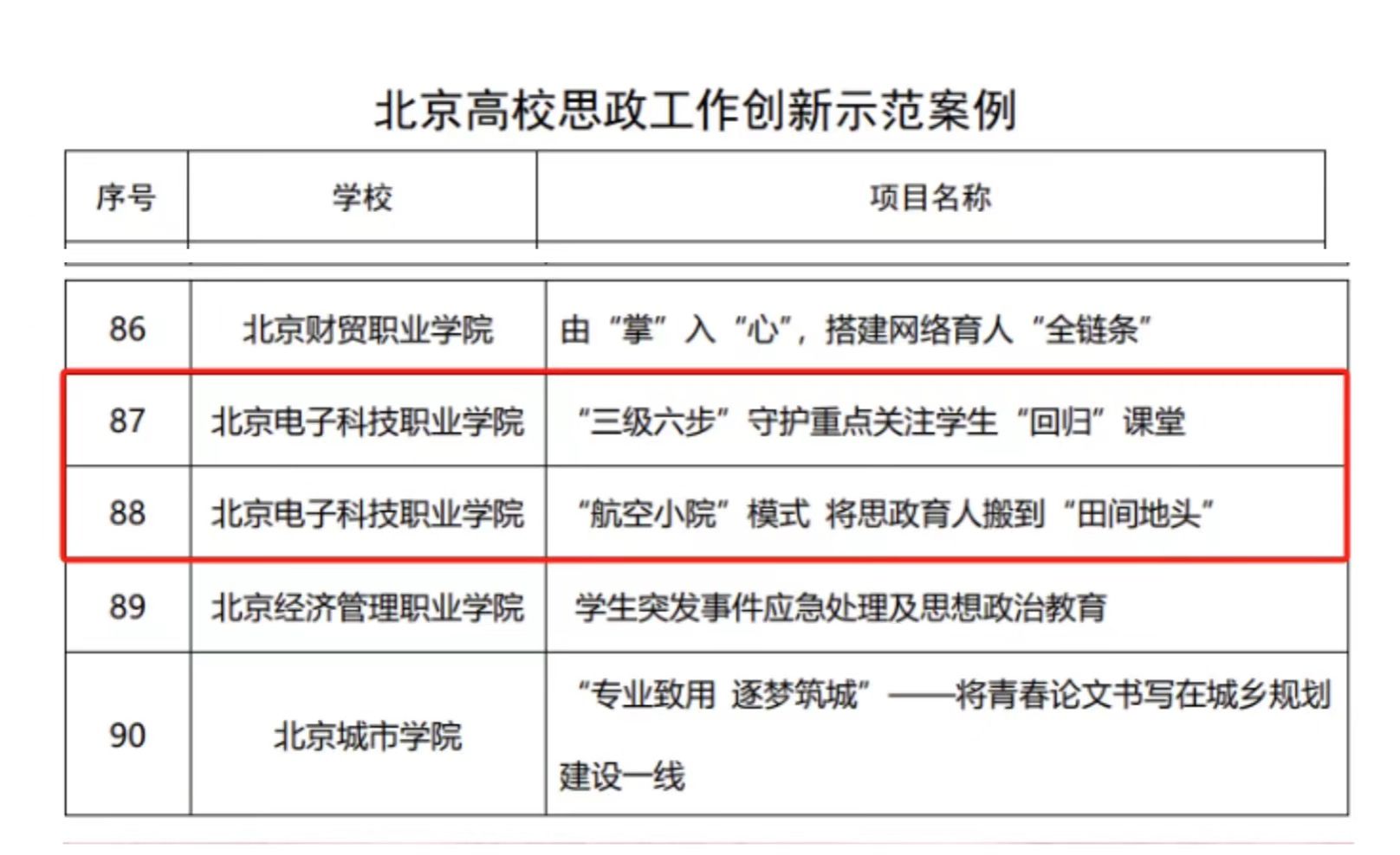 在近期中共北京市委教育工作委员会组织的新时代北京高校思想政治工作创新示范项目遴选工作中,BEAT3653个项目入选。其中,“海棠花开思政工作室”入选北京高校思政工作创新示范工作室(培育类),“‘三级六步’守护重点关注学生‘回归’课堂”“‘航空小院’模式 将思政育人搬到‘田间地头’”入选北京高校思政工作创新示范案例。
