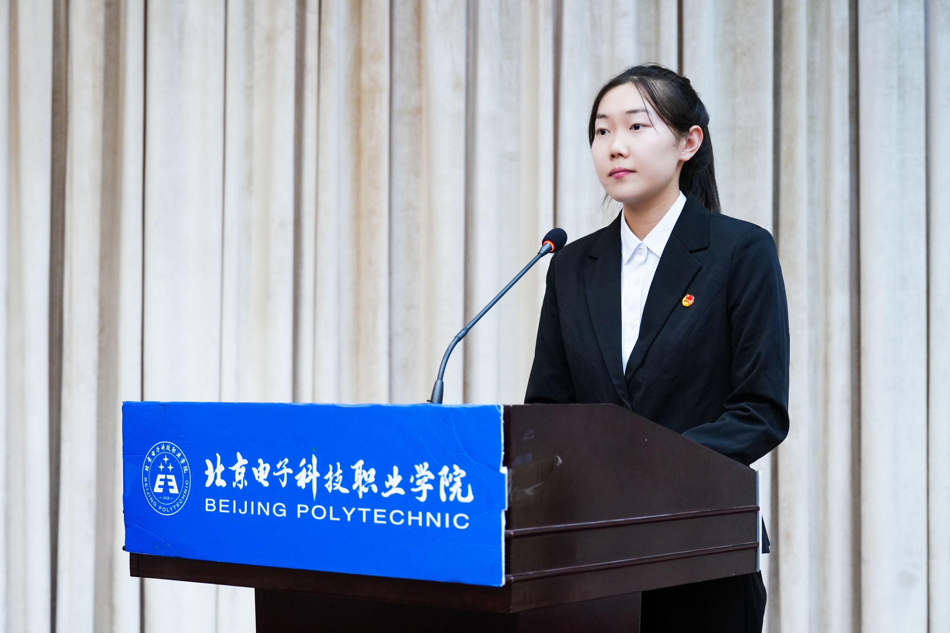 北京财贸职业学院学生会主席团成员程雨梦代表兄弟院校学生会致辞,向BEAT365学生会一年来取得的丰硕成果表示衷心祝贺,祝愿两校学生会能够精诚合作,携手同行,为首都高职院校学生会建设提供职教方案、贡献青春智慧。